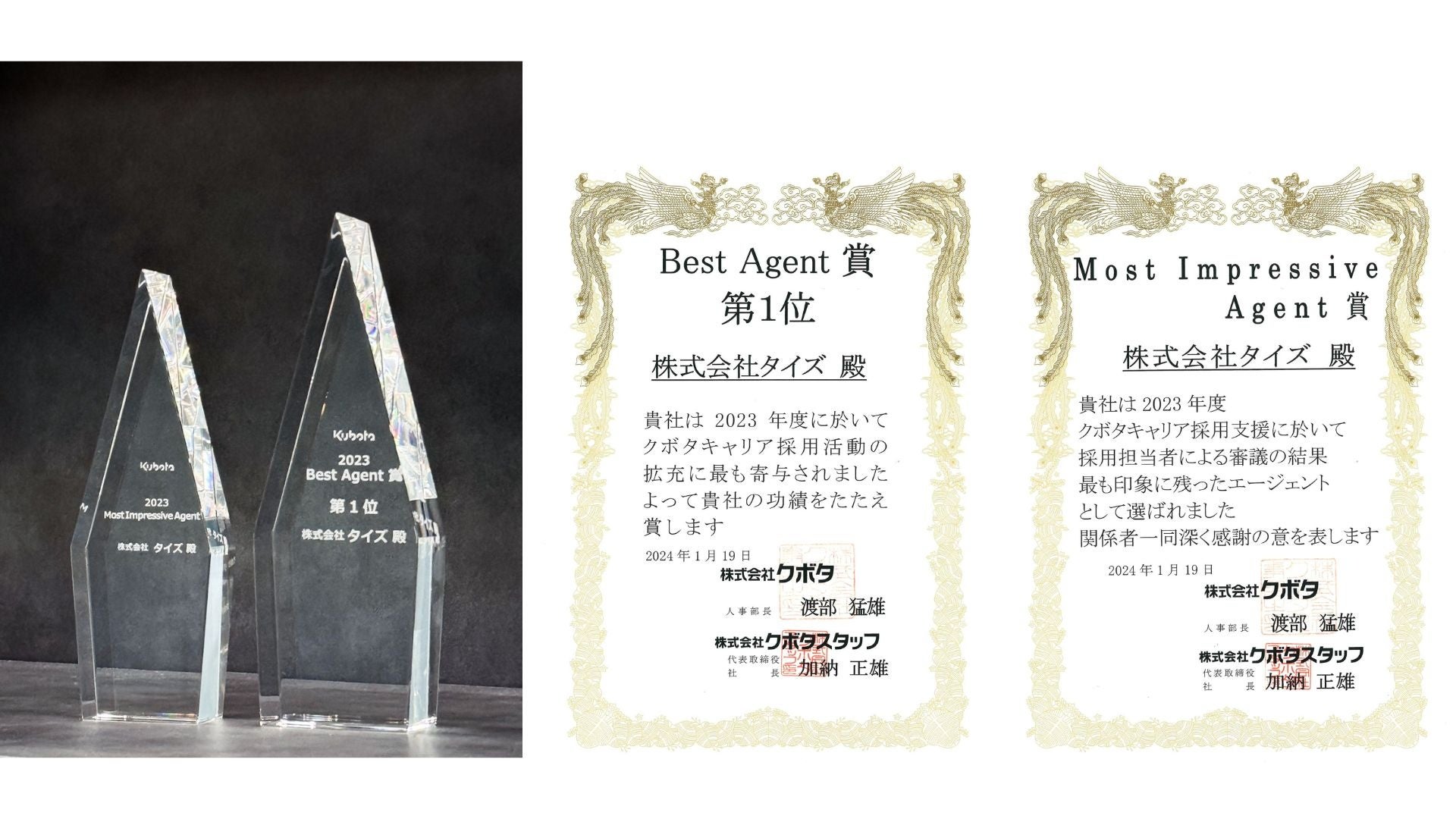 この度タイズは採用を支援しているクボタ社にて転職エージェントにおける中途入社人数シェアNo.1を獲得し、その採用実績と質を称えられ2023年度ベストエージェント賞第1位を受賞いたしました。厳選された対象の転職エージェント約40社の中から選ばれ、昨年に引き続き二年連続の受賞となります。さらにこの度、クボタ社キャリア採用の複数名いる担当者の中で最も印象に残ったエージェントとして2023年度Most Impressive Agent賞もW受賞いたしました。クボタ社キャリア採用責任者(相原様)より「推薦の数や候補者の質は申し分なく、今後も採用の充足に向けて良きパートナーとして共に歩んでいければと期待しています。」といったお声も頂きました。