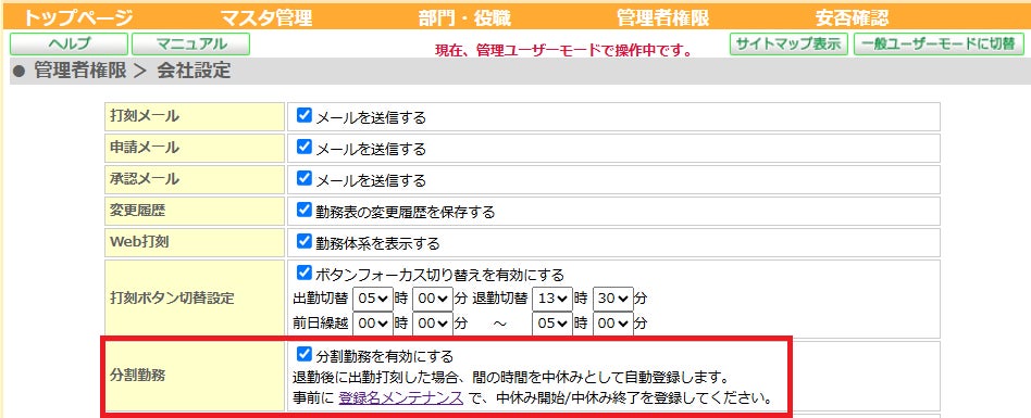 あらかじめ1日に複数回の出退勤が決まっている場合にもご活用いただけます。通常は出退勤打刻を複数回行った場合、出勤は一番初めの打刻、退勤は一番最後の打刻を用いて労働時間の計算を行います。しかし分割勤務を有効にすると、出勤と退勤のペアごとに労働時間として計算し、退勤と出勤の間を中休みとして休憩時間も自動で計算を行います。