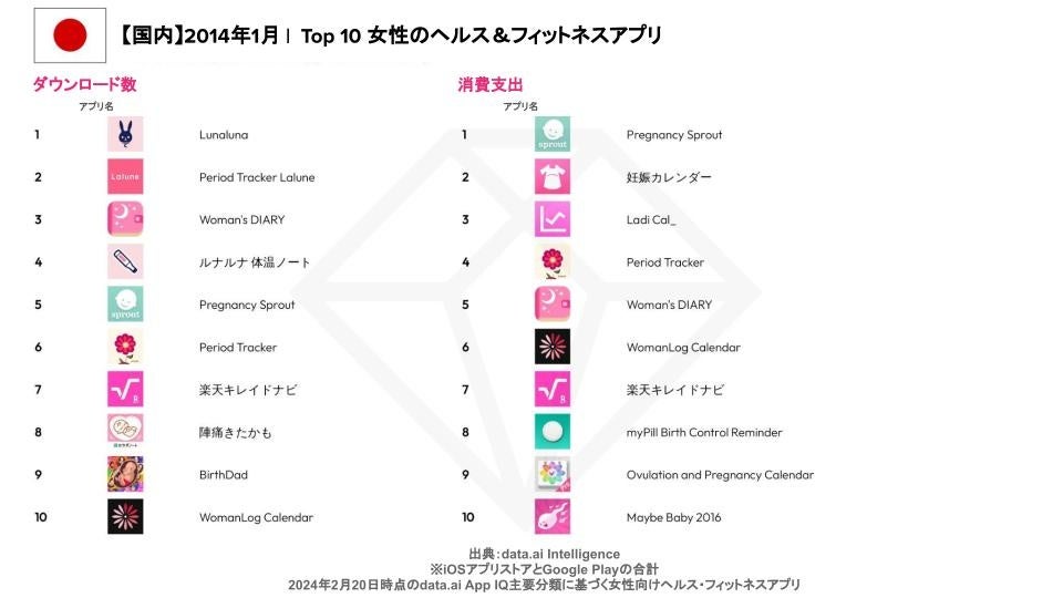 10年前となる2014年のダウンロード数ランキング(上位10位)で1位であった「ルナルナ」は、2024年1月時点でのダウンロード数でも引き続き1位を維持しています。