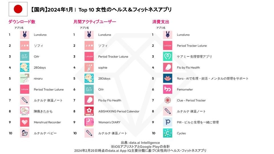 *下記のデータは2024年2月20日時点のdata.ai App IQ主要分類に基づく女性向けヘルス・フィットネスアプリによるものです。
