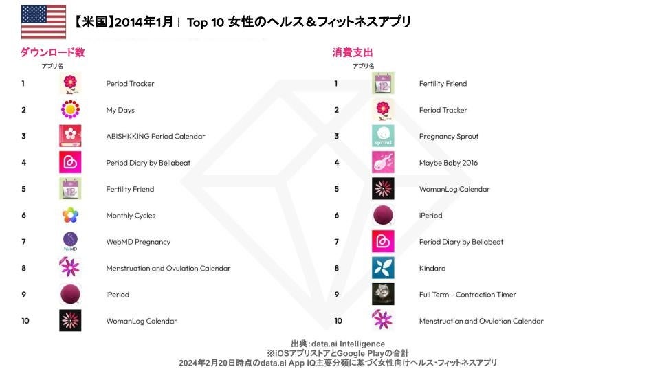 また、米国と日本のランキングを比較すると、アプリがあまり被らないことから、各市場独自のフェムテック関連アプリが勢力を保持していることが窺えます。