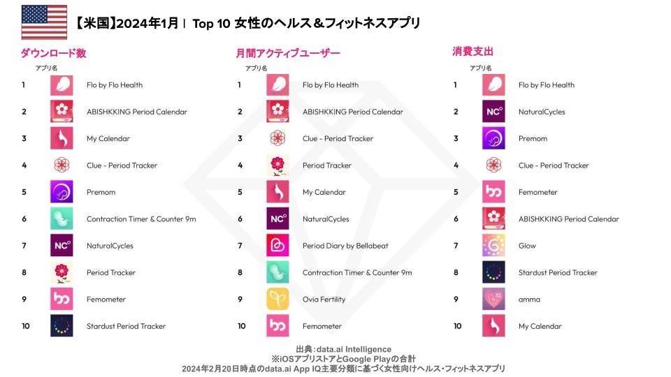 米国でも類似のトレンドがみられ、2024年1月のダウンロード数・月間アクティブユーザー・消費支出ランキングの1位はすべて「Flo by Flo Health」が牛耳っています。