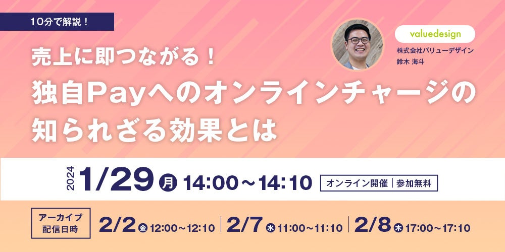 バリューデザイン、2024年1月29日に10分完結のWEBセミナー「売上に即つながる!独自Payへのオンラインチャージの知られざる効果とは」を開催