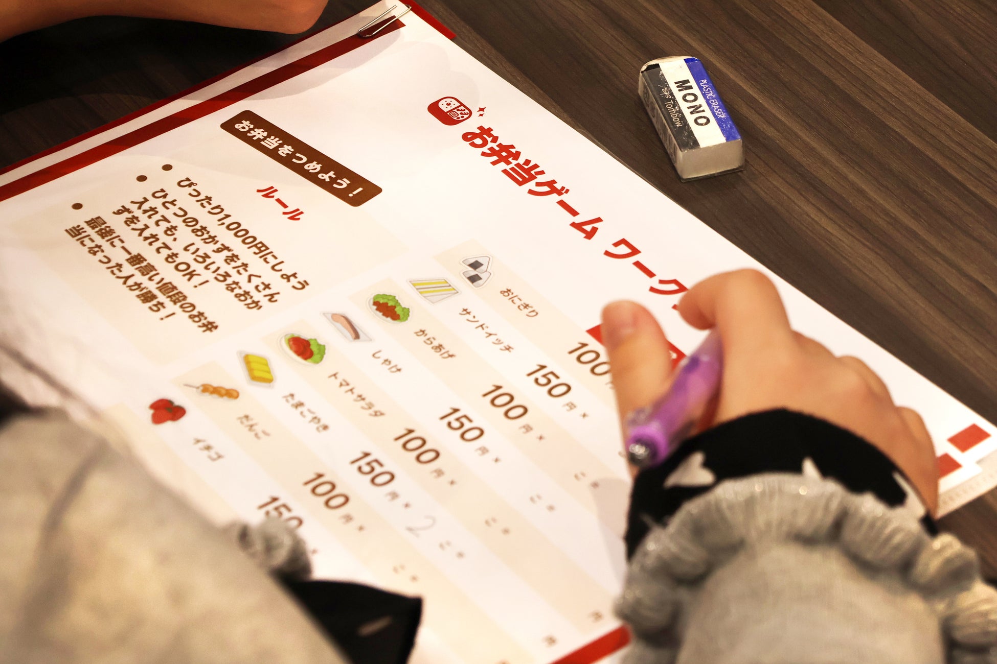 子どもたちは、それぞれ手元のワークシートを埋めながら好きなお弁当を作っていきます。最終的に一番高く売れるお弁当を目指して、親子で活発に話し合う様子が見られました。