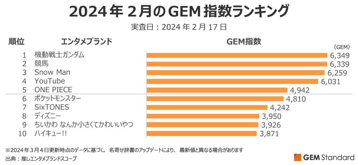 エンタメブランドの総合価値指標である「GEM指数」の2024年2月調査において、『機動戦士ガンダム』がGEM指数ランキング1位を獲得しました。その後、2位に『競馬』、3位に『Snow Man』と続きます。