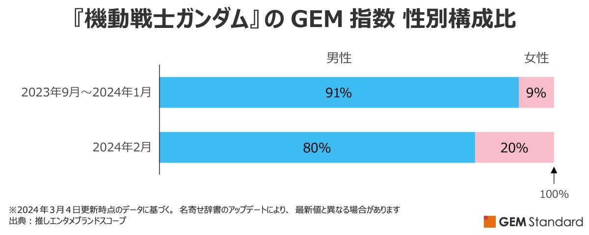 下記は『機動戦士ガンダム』におけるGEM指数の性別、年代別の構成比を2023年9月~1月の平均と2024年2月で比較したものです。性別構成比では女性割合が、年代別構成比では20代の割合がそれぞれ高まっています。GEM指数の上昇は、これらのセグメントの貢献が大きく、したがってこれまでとは異なるファン層でブランド価値が広がったと考えられます。