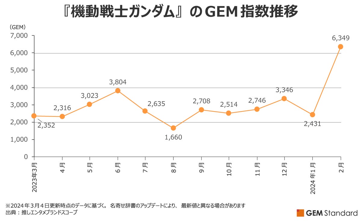 しかし、2月のGEM指数はさらに高まっています。2024年1月26日に劇場公開された映画『機動戦士ガンダムSEED FREEDOM』が大ヒットしているなか、最新2月17日の調査では、6,349GEMと大幅に上昇しました。これにより、GEM指数ランキング1位獲得となりました。