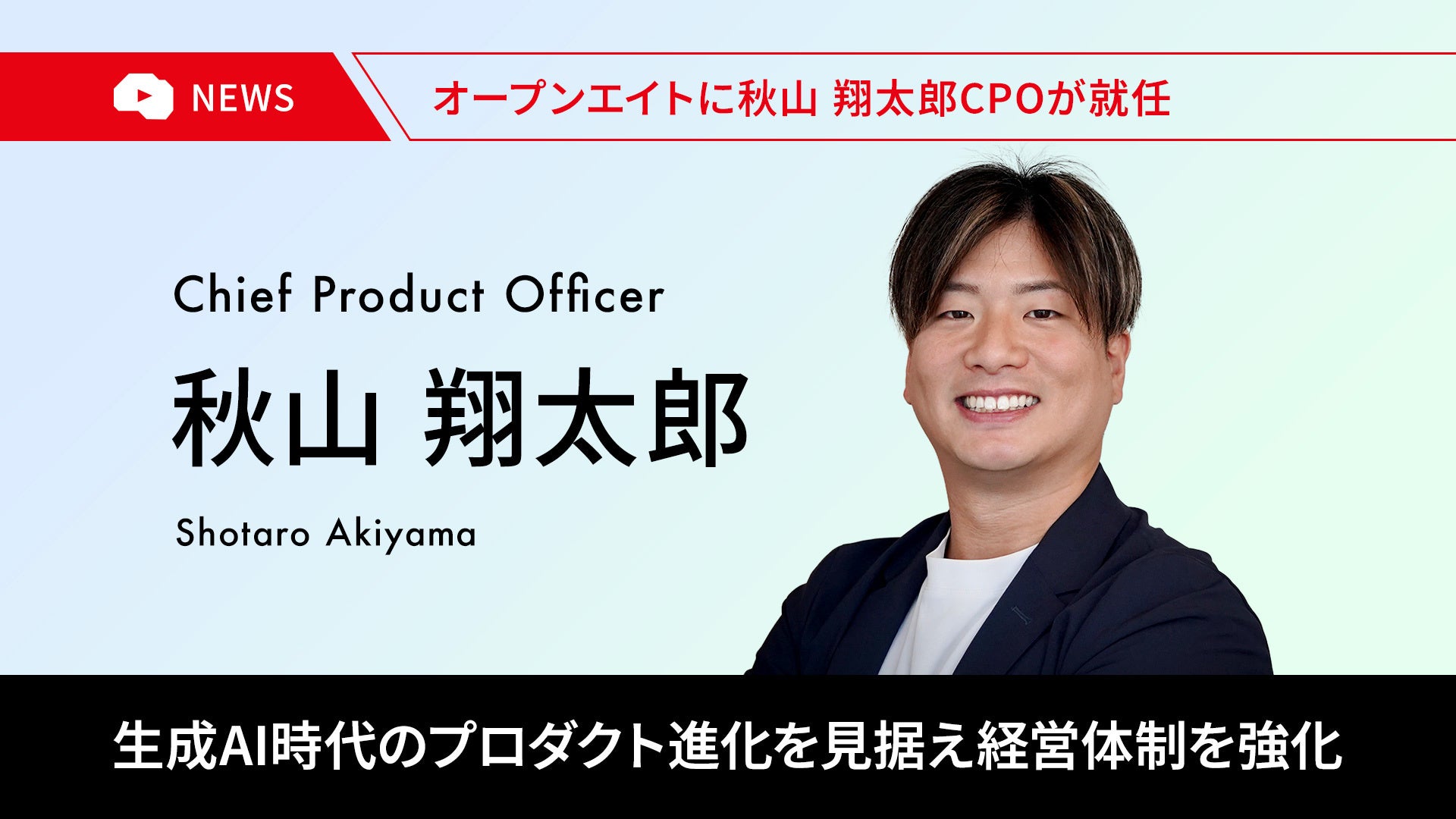 株式会社オープンエイト(本社:東京都千代田区、代表取締役社長兼CEO:髙松雄康、以下オープンエイト)は、秋山翔太郎がChief Product Officer(CPO)に就任したことをお知らせいたします。