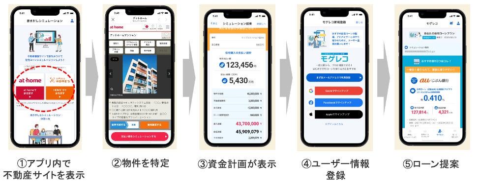 これらの課題を解決するため、モゲチェックは不動産情報サイトのLIFULL HOME'S及び不動産情報サイト アットホームと連携し、新たにアプリを開発して、マイホーム検討中のユーザーに対して物件探しと住宅ローン選びが両方にできる新サービスを提供します。使い方は下記の3ステップです。