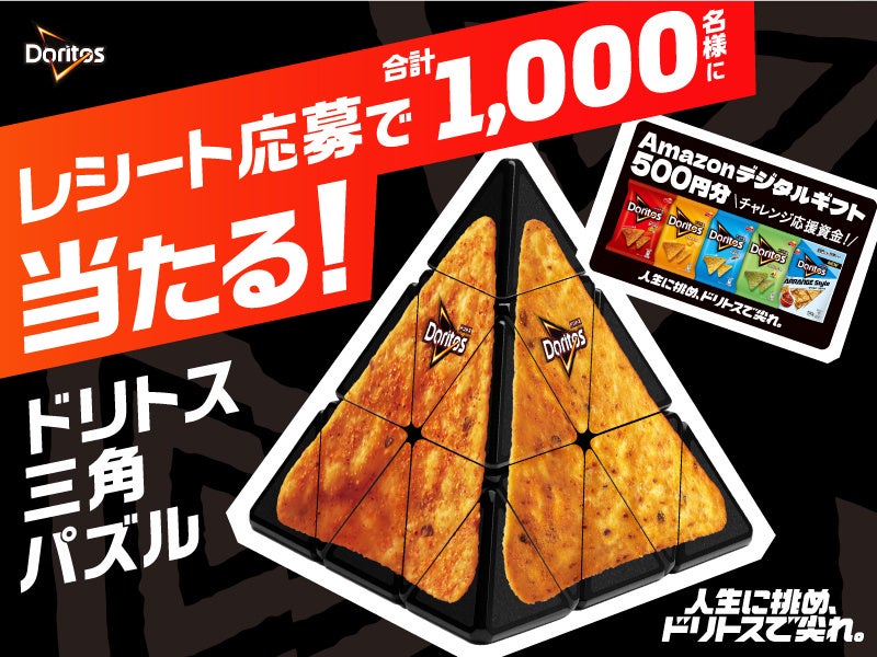 期間中にドリトスを1つ以上購入し、レシートの写真をWEB応募フォームからアップロードすると、抽選で200名様に「ドリトスオリジナル三角パズル」が、抽選で800名様に「Amazonギフト券 500円分」が当たります。1度崩してしまうと揃えるのが難しい、挑戦しがいのあるパズルです。
