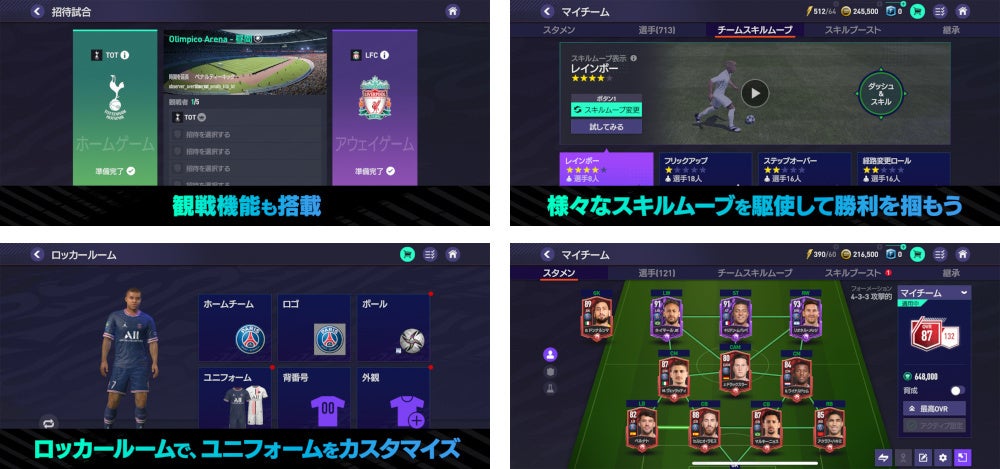 『FIFA MOBILE』では、本物のクラブや選手を使って自分だけのオリジナルチームを作り、11対11のオンライン対戦はもちろん、ゴール数を競う「VSアタック」、昇格・降格ありの本格的なリーグ戦を体験できる「シミュレーションリーグ」、戦術や指示を駆使してリーグ昇格を目指す「マネージャーモード」、各種スキルゲームなど、お好みに合わせて多彩なコンテンツをお楽しみいただけます。また、背番号を含む多彩なカスタマイズが可能な「ロッカールーム」機能で、自分だけのチームを作ることもできます。