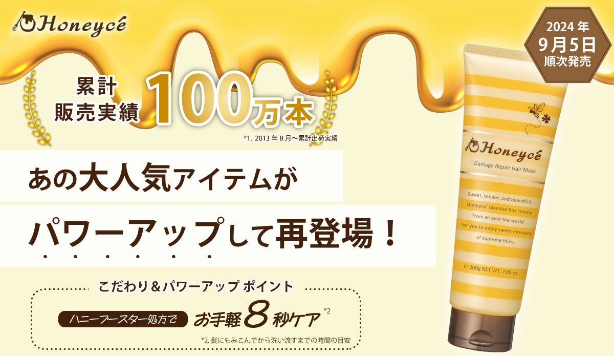 株式会社b-ex(ヨミ:ビーエックス、本社:東京都世田谷区、取締役社長:福井 敏浩)は、髪と肌を想うハチミツヘアケアブランド「Honeycé(ハニーチェ)」から、累計販売本数100万本を突破した大人気ヘアマスクの改良復刻品「ハニーチェ ダメージリペア ヘアマスクY R」を発売いたします。発売から11年を迎えたハニーチェの中でもロングセラーアイテムのひとつとなっておりましたが、この度、機能性をアップさせ8秒※2でなめらかな髪へと導くアイテムとして生まれ変わりました。9月5日(木)より順次発売します。