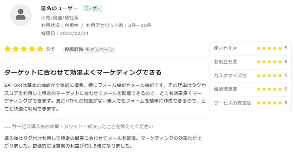MAツール「SATORI」のお客様に良いサービスであると評価をいただき、お客様の成果に少なからず寄与できているのだと実感しています。私たちSATORIは、マーケティングの可能性を伝えていくことをミッションとしており「マーケティングで成果が出た、取り組んで本当に良かった」という顧客の声は、何よりも喜びを感じます。今後も自らのマーケティング活動に挑戦し続けるとともに、「あなたのマーケティング活動を一歩先へ」というスローガンのもと、サービス向上に努めてまいります。引き続き、ご支援の程宜しくお願い致します。