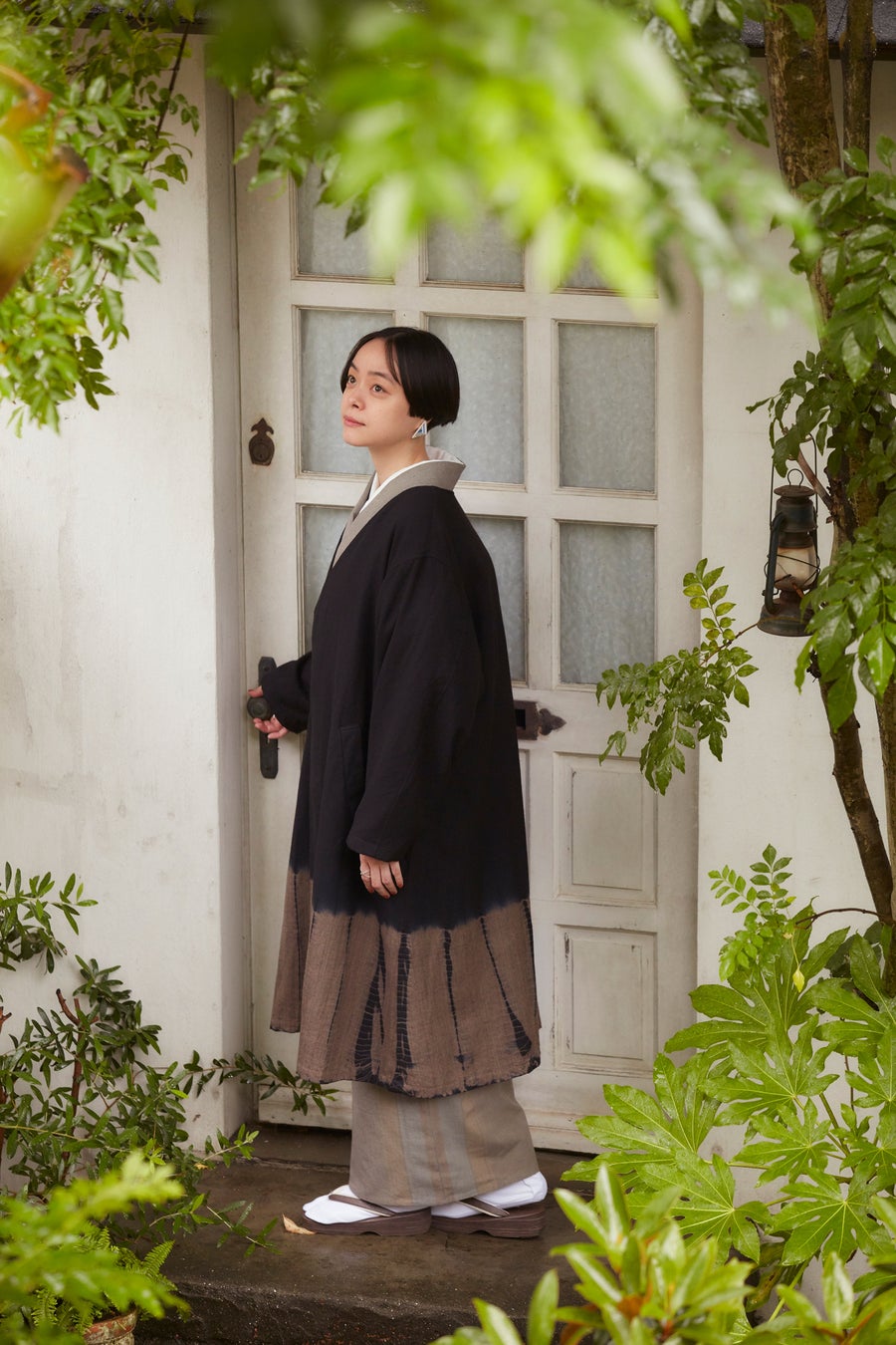 昨年より登場した、ツイード素材のPコート。秋冬らしさを感じられるツイード素材に絞り加工を施した一着。尾州で織られたツイード生地は、タンブラー加工を施すことでふんわりとした仕上がりで、羽織った時の軽さと暖かさが魅力です。裾部分は『帽子染め分け絞り』の染め分けによる滲みが、機械では生み出せない趣のある表情を見せてくれます。大きめな衿は着姿のポイントとなり、洋服でもきものでもご着用いただけるコートです。