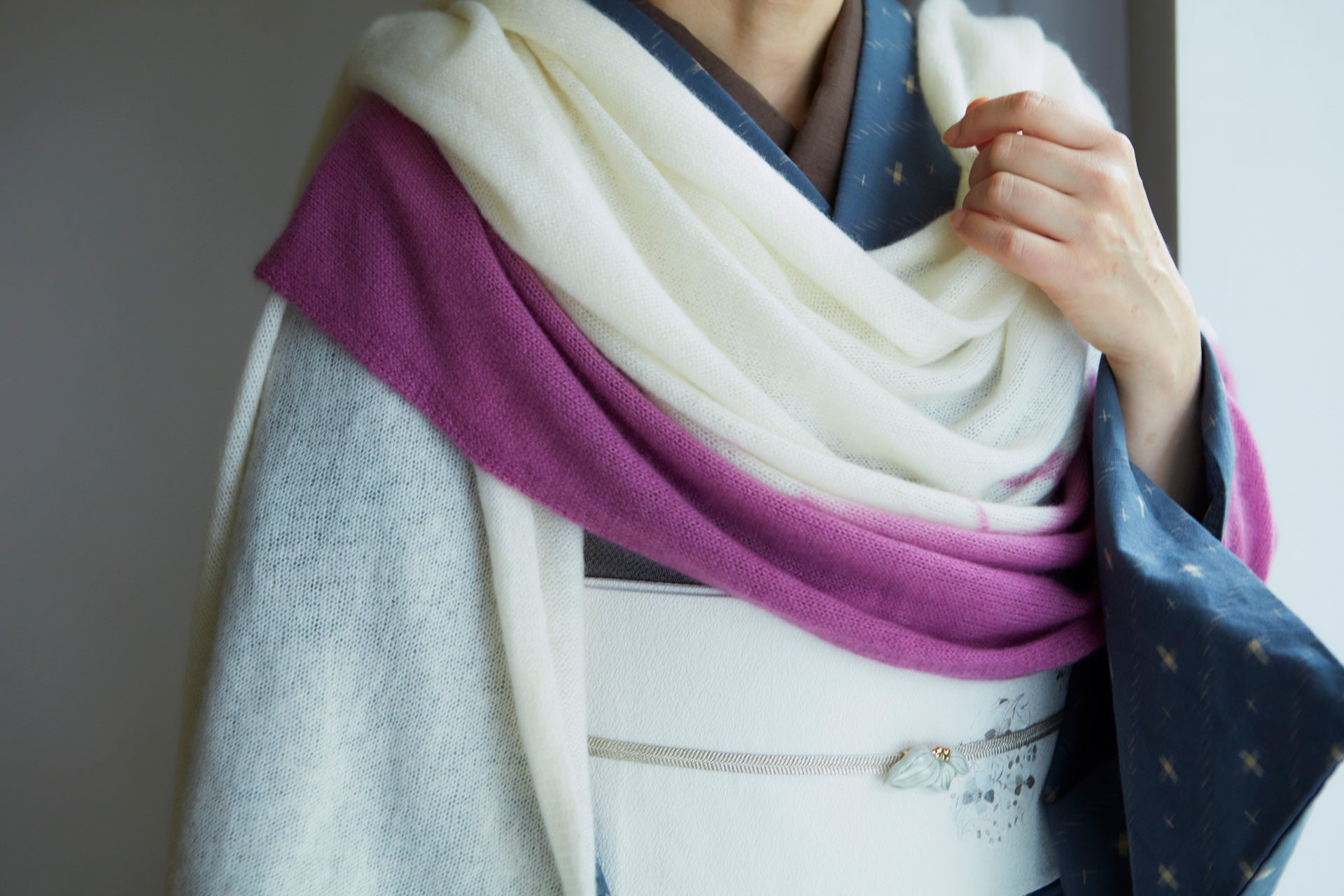 保温性が高く、滑らかな肌触りがとても心地よいショールです。絞りの技法によって生み出される表情の違いを楽しめるアイテム。ニット素材×絞りの新鮮なデザインがきものとの相性も良く、秋冬の着姿を彩ります。モンゴルで一貫生産されている上質なカシミヤ100%を使用。