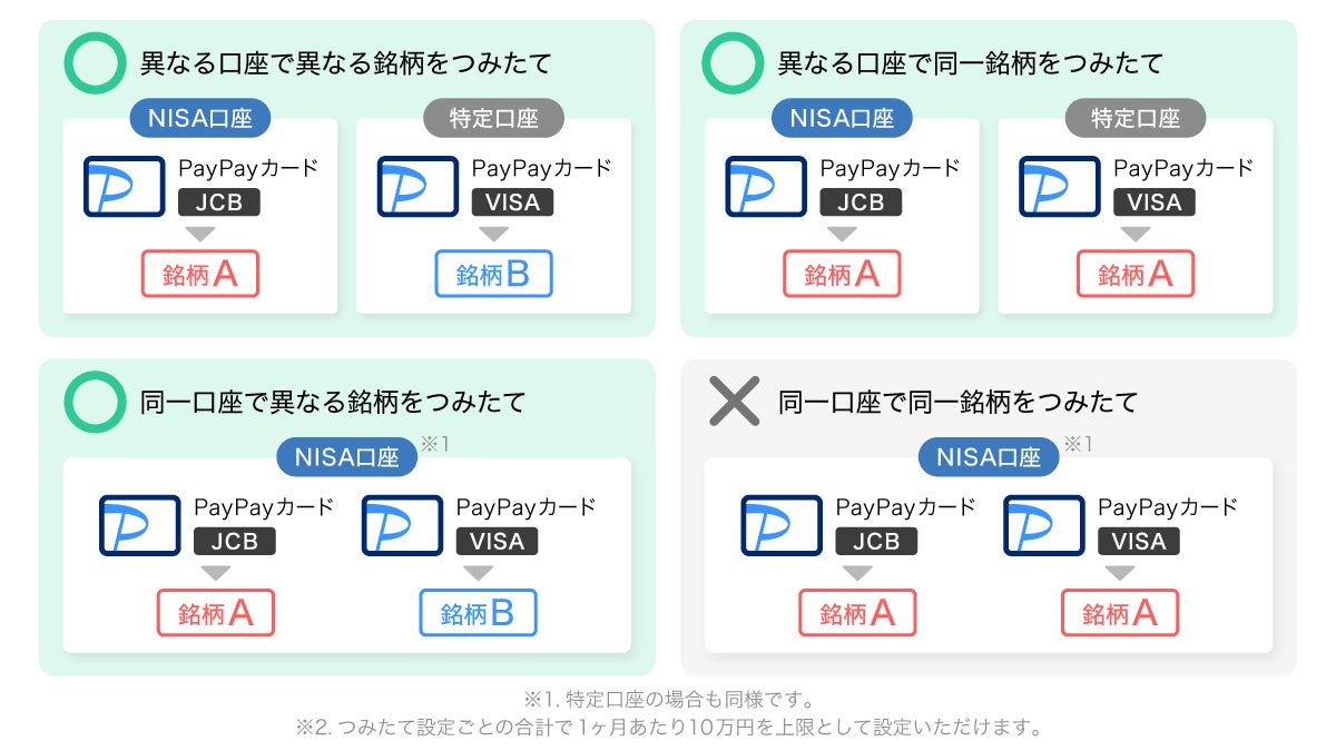 ただし、同一口座で同一銘柄を異なる「PayPayカード」を使ってつみたてすることは出来ません。