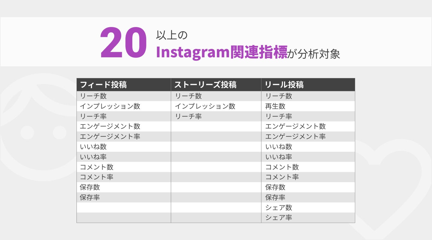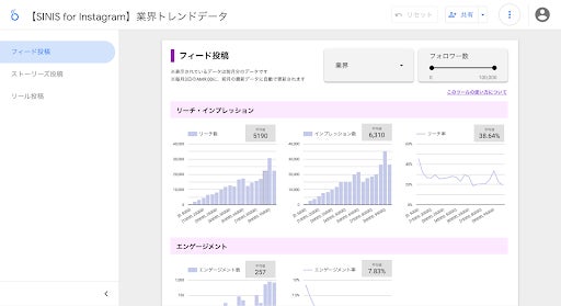 自社アカウントのデータだけでは読み取れない業界ごとの「保存数」「インプレッション数」「リーチ率」など20以上の重要なInstagram関連指標の平均値を参考にすることができます。
