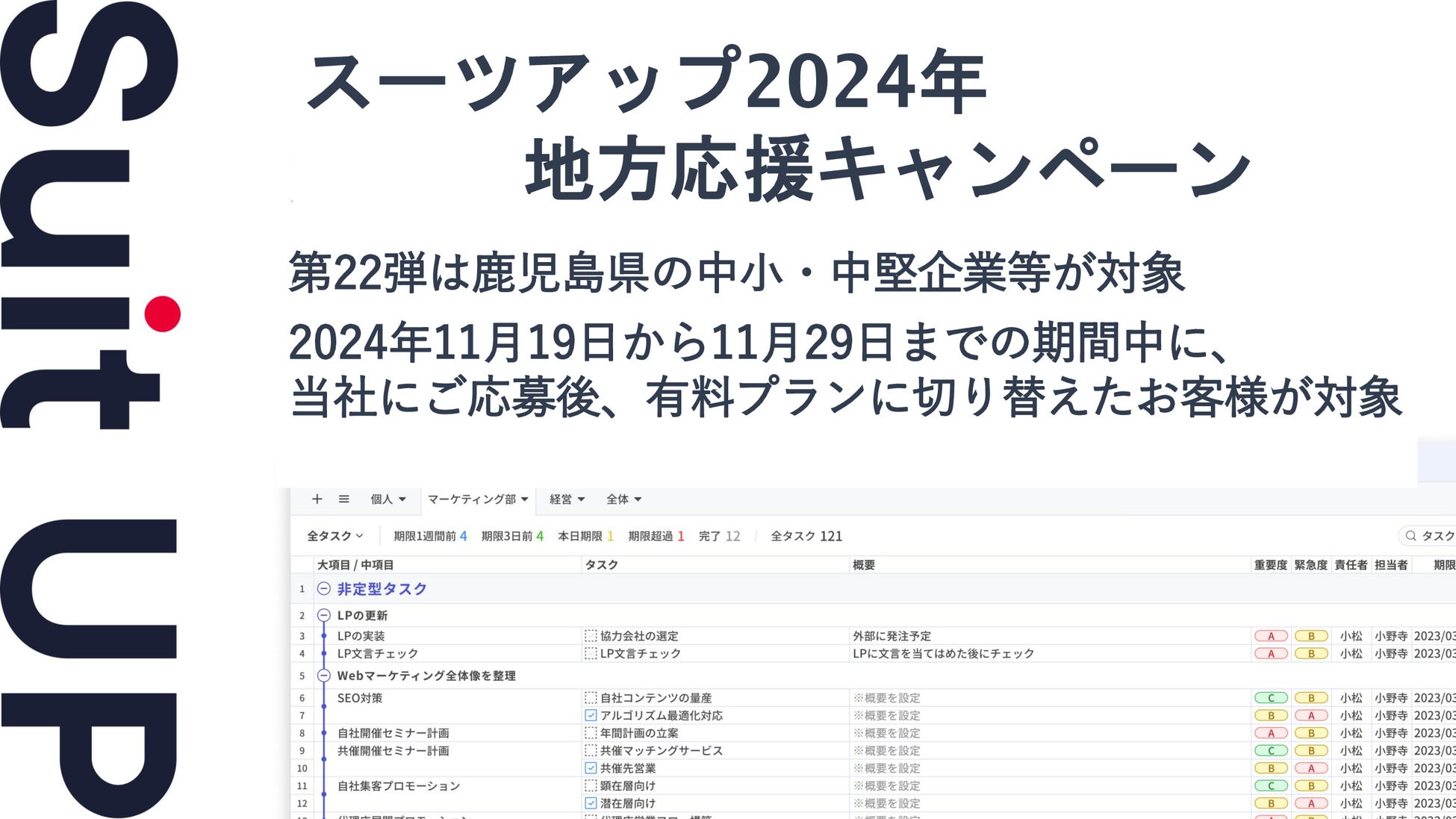 株式会社スーツ(所在地:東京都千代田区、代表取締役社長CEO:小松 裕介)は、「スーツアップ2024年地方応援キャンペーン」第22弾として、鹿児島県の社員数100名未満の中小・中堅企業、スタートアップを対象に割引キャンペーンを実施いたします。