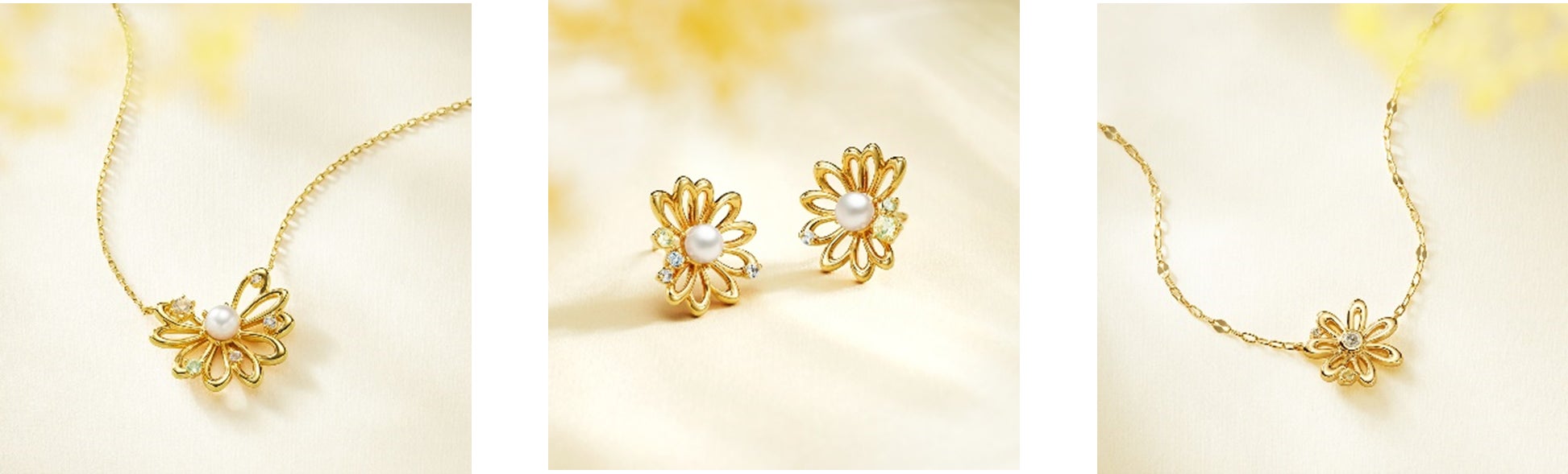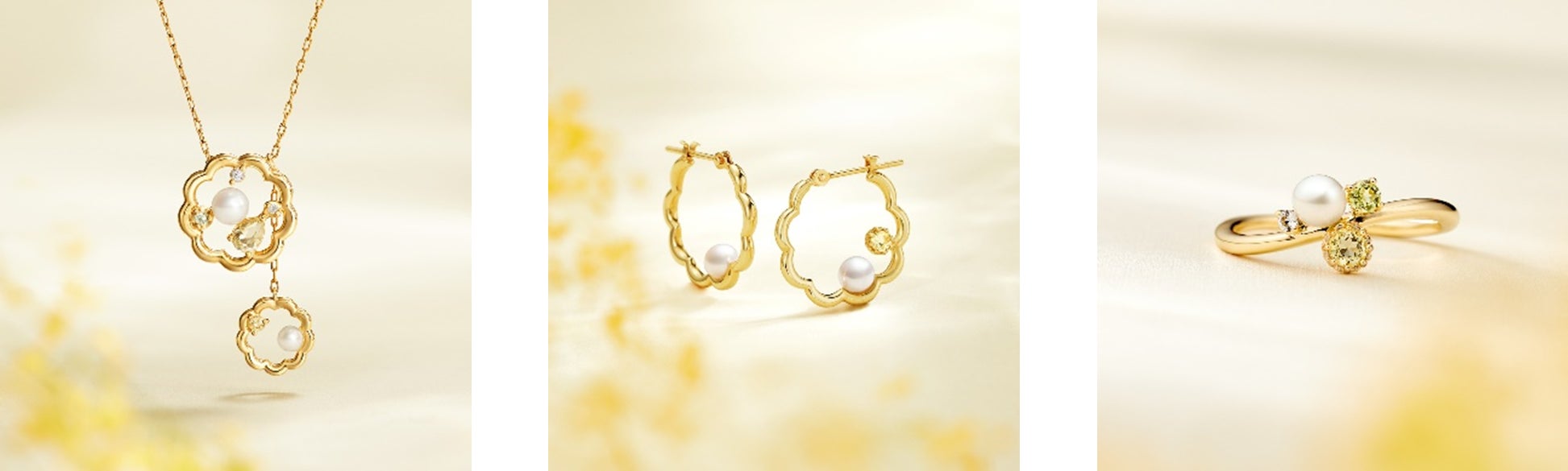 厳しい冬を乗り越え、春の朗らかな陽の光のもと心地よい幸福感をまとった花々を描いたジュエリーは、心まであたたかくなるようなポジティブなエネルギーを放ちます。ミモザやデイジーの花束をイメージさせるようなゴールドカラーを基調としており、風が通り抜けるような軽やかなデザインや、爽やかな天然石のミックス感が春らしい魅力を引き立てます。