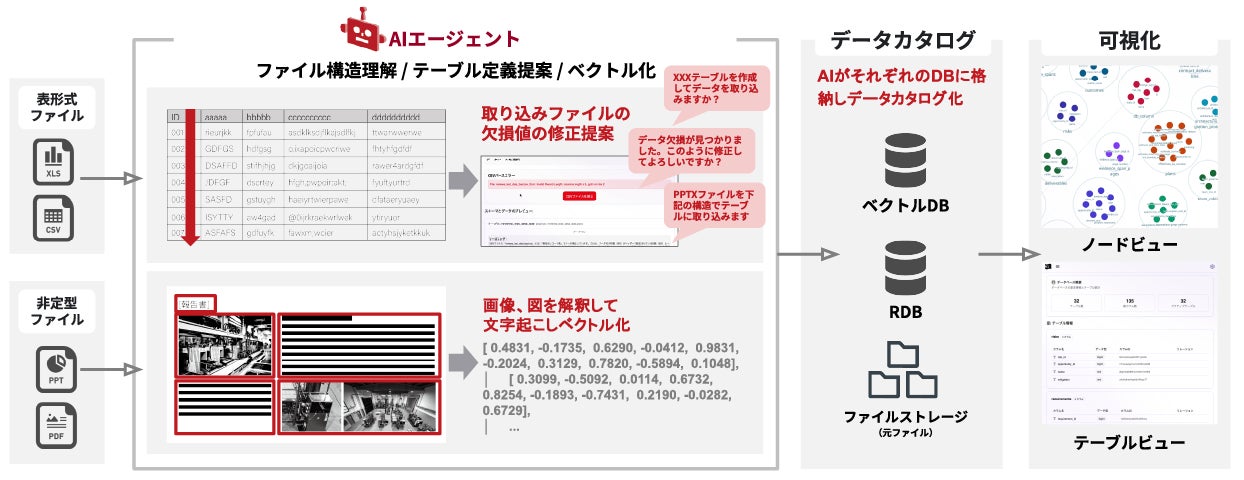 表形式ファイル(Excel、CSV)では構造を理解しテーブル定義を決定、情報に欠損値があった場合、修正提案を行った上で自律的にデータを修正しデータカタログへ登録します。また、非定型ファイル(PowerPoint、PDF)は、画像や図を文字に起こし、ベクトルおよびテーブル化した上で同じくデータカタログに登録し、データ基盤が構築されます。