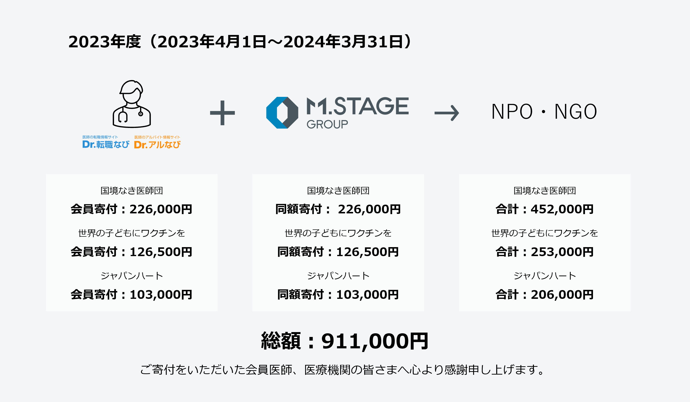 「マッチングギフト制度」は、私たちの事業ではカバーしきれない領域において活動をするNPO・NGO団体を支援することで、“持続可能な社会の実現”への貢献をめざす取組みです。2024年3月で12年目を迎え、2023年度(2023年4月~2024年3月)の寄付は、医師や医療機関からのポイント寄付と合わせ、総額911,000円となりました。
