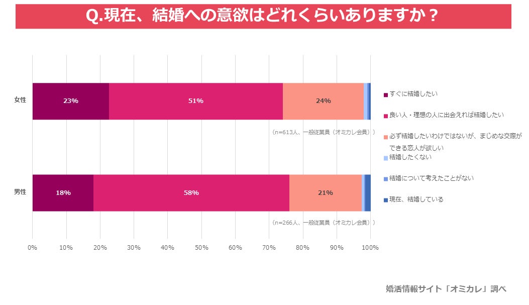 婚活情報サイト・オミカレ会員879人へのアンケート調査によると、全体の約98%がまじめな交際・結婚を望んでいることがわかっています。