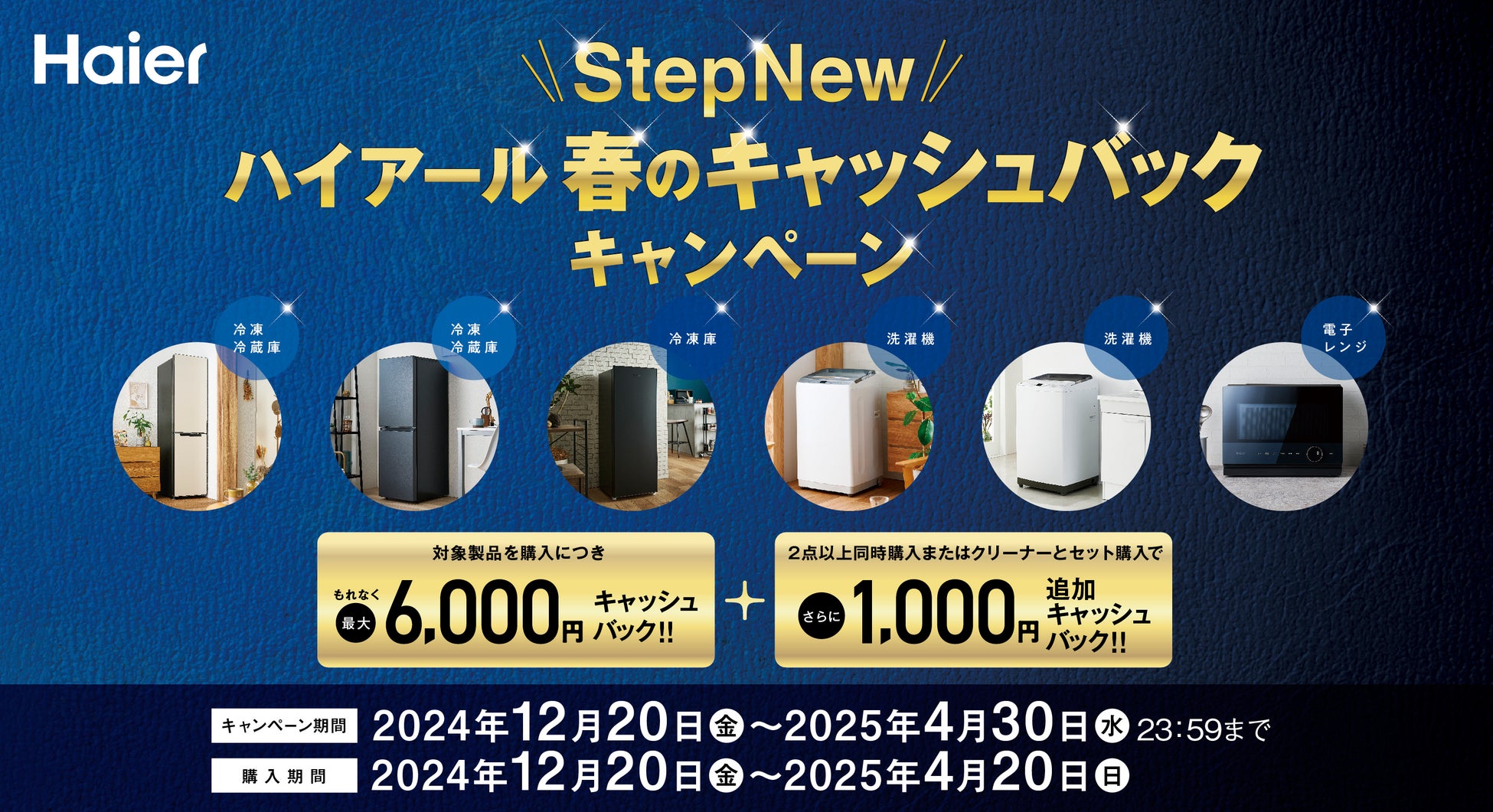 ハイアール ジャパン セールス株式会社(本社:大阪市、代表取締役社長:杜 鏡国)は、期間内に対象のハイアール製品をお買い上げいただき、ご応募いただいた方全員に最大6,000円をキャッシュバックする「StepNew ハイアール 春のキャッシュバックキャンペーン」を、12月20日(金)より開始いたします。