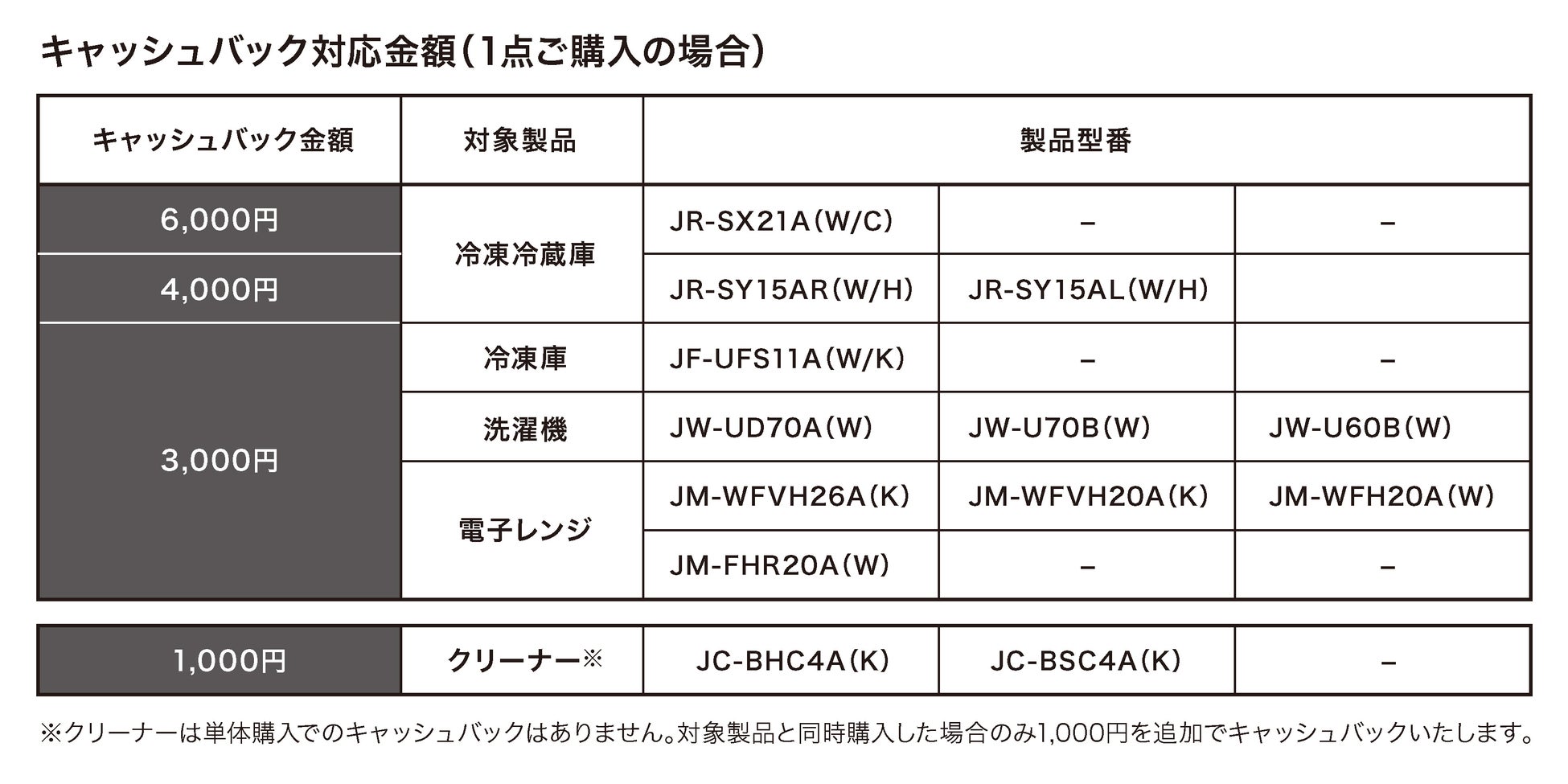 対象製品/キャッシュバック額