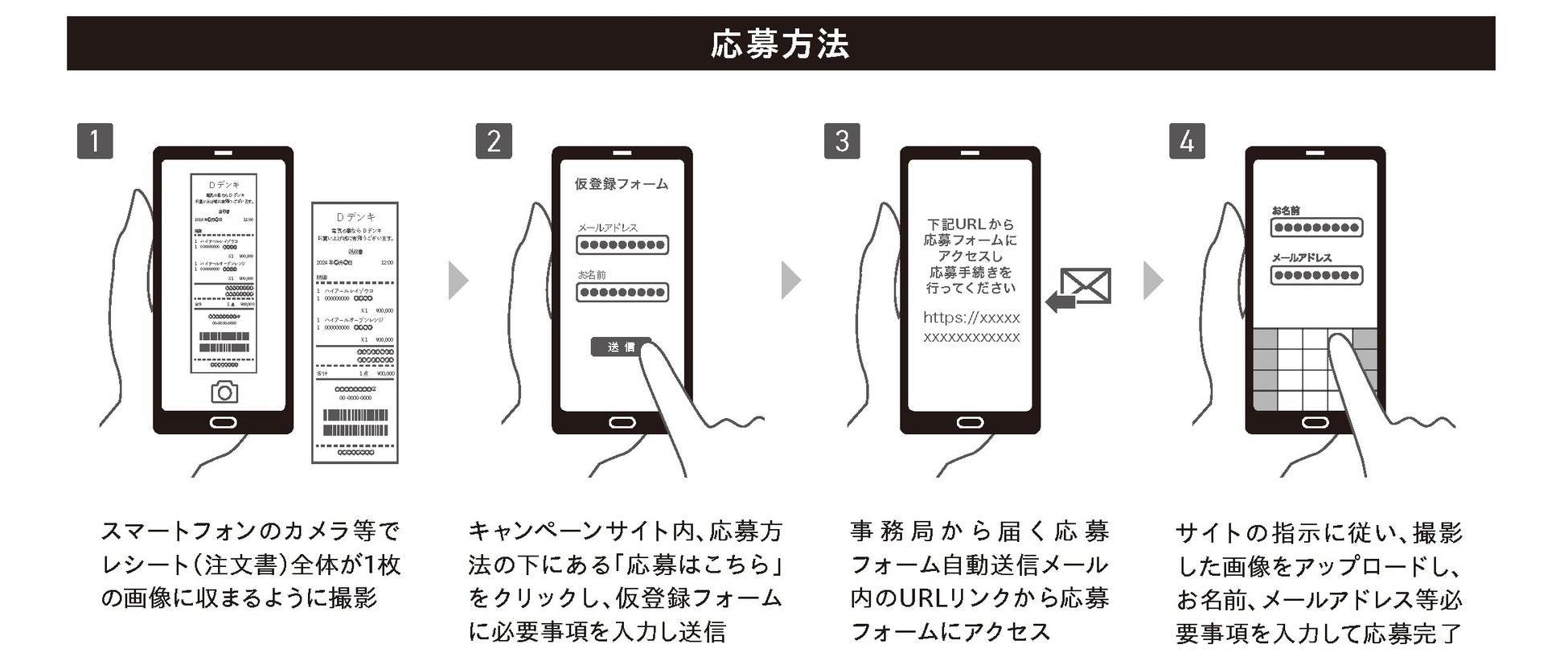 対象となるレシートの情報(購入日、購入製品、店舗、購入金額)が分かるように撮影し、画像をWEB応募フォームから送信してください。