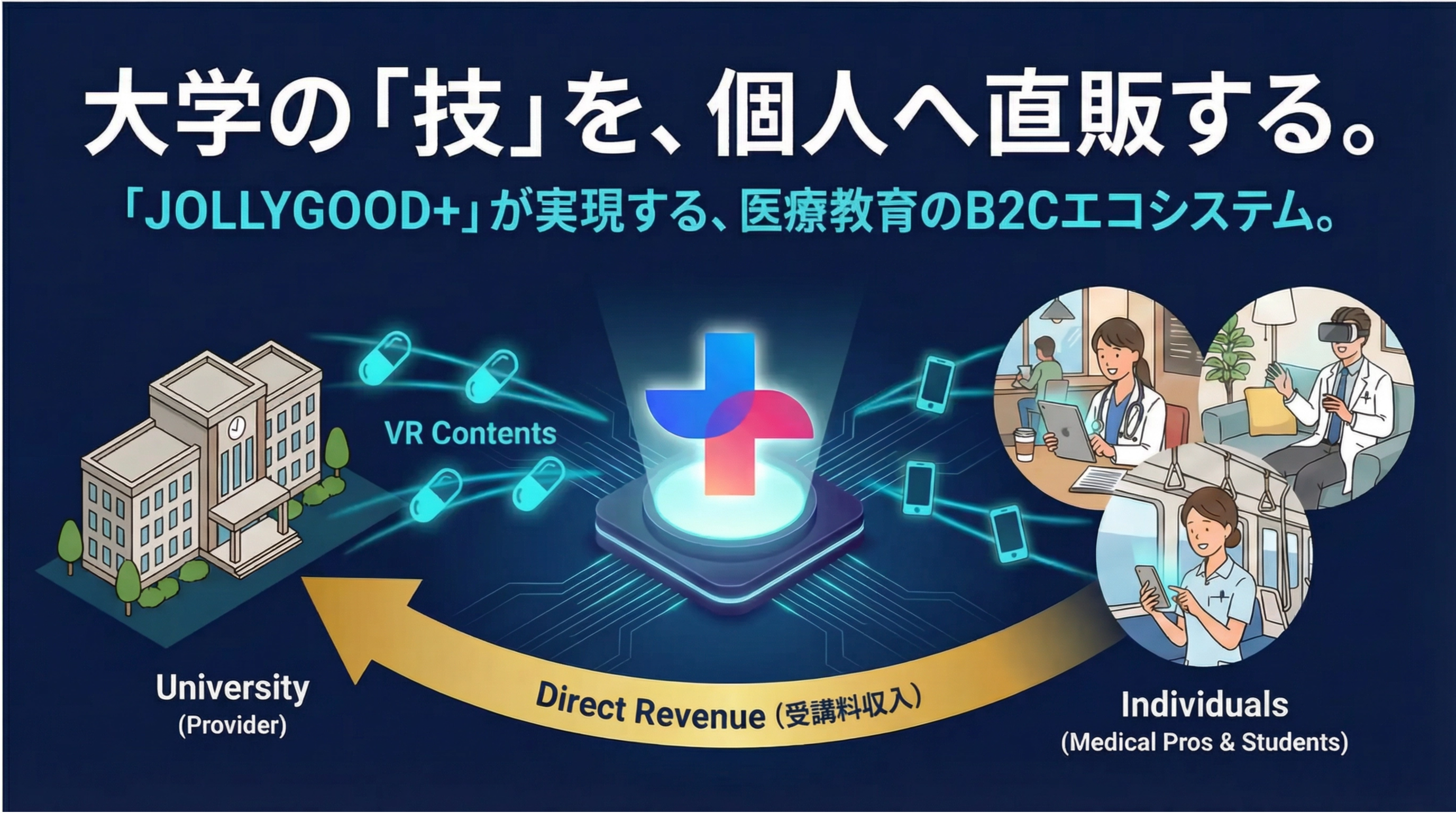 「これまで『ツールを使う側(消費)』だった大学が、これからは『コンテンツを提供して稼ぐ側(生産)』に回る。そのためのプラットフォームと制作体制を整えました。JOLLYGOOD+は、単なる学習アプリではなく、日本の高度医療を世界中の個人へ届ける『医療教育のマーケットプレイス』へと進化します。」