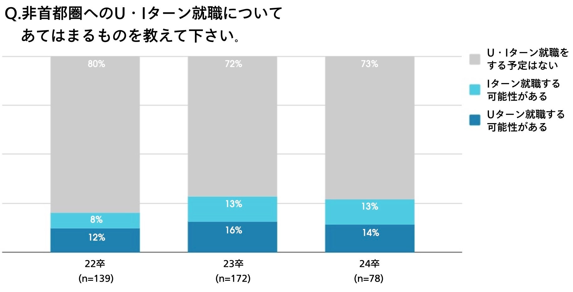 U・Iターン就職の可能性について聞いたところ、22卒が最も低く20%であったのに対し、23卒は29%、24卒は27%という結果に。「場所には固執していないので、状況次第では就職先はどこでも大丈夫です。」(HAL大阪、三年生)という声もあがりました。