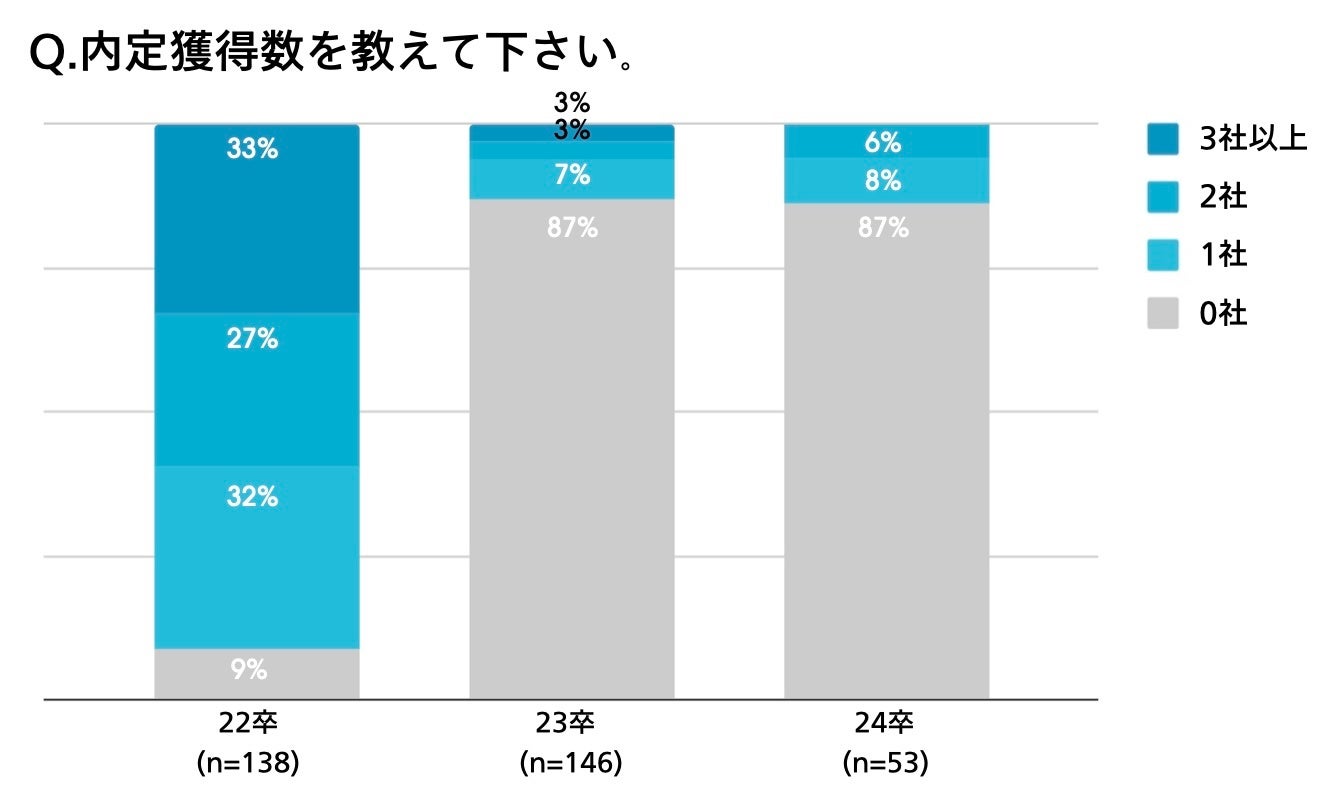 内定獲得状況について聞いた所、22卒については91%が内定を獲得しており、23卒、24卒については、それぞれ13%の学生が既に1社以上の内定を獲得しているという結果に。