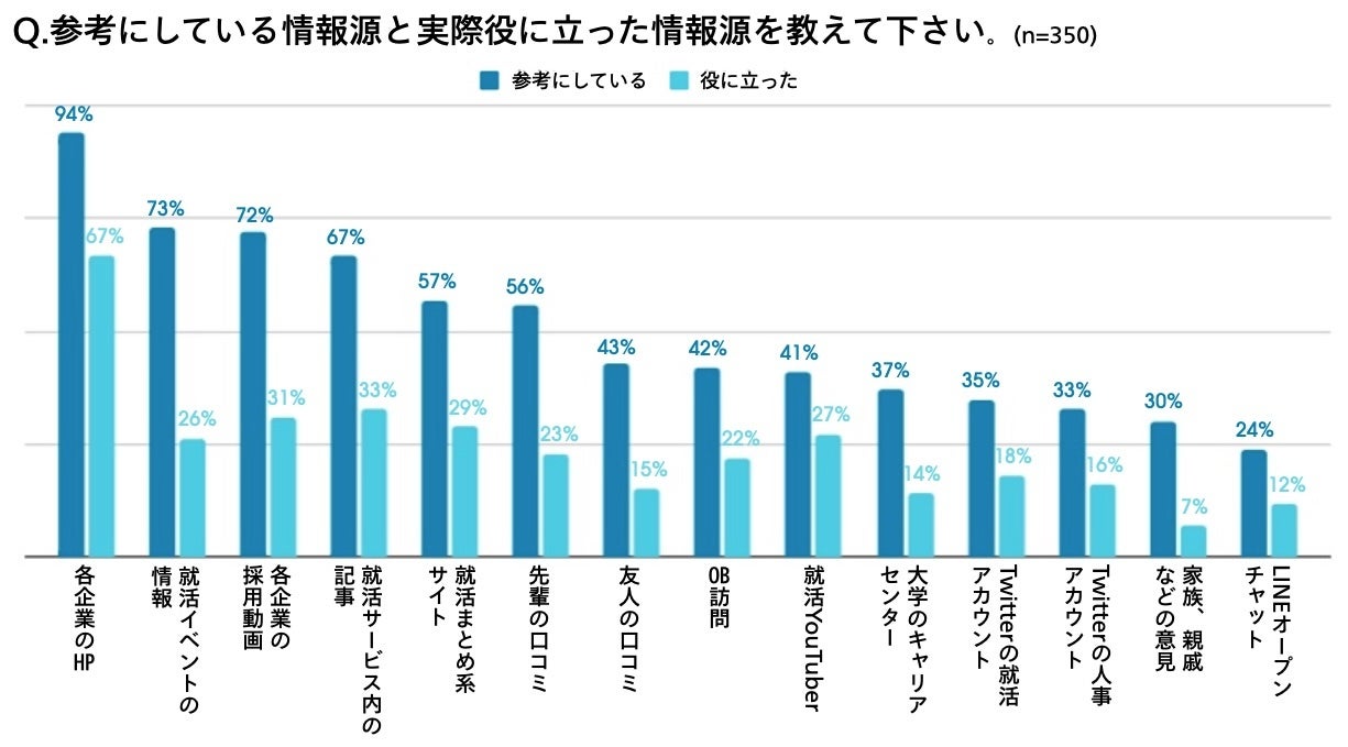 就活生が「とても参考にしている」と回答した情報源のトップは「各企業のHP(94%)」となり、次点で「就活イベントの情報(73%)」、「各企業の採用動画(72%)」が続いた。次に実際に役に立った情報源について聞いてみると、トップは「各企業のHP(67%)」で変わらなかったものの二番目以降に変化があり、参考にしている情報源では二番目だった「就活イベントの情報(26%)」が「就活サービス内の記事(33%)」や「各企業の採用動画(31%)」「就活Youtuber(27%)」を下回る結果となりました。