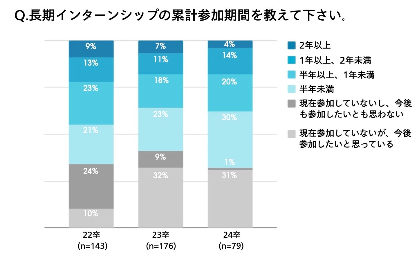 ・長期インターン参加経験比率が最も高いのは24卒(22卒:66%、23卒:59%、24卒:68%)