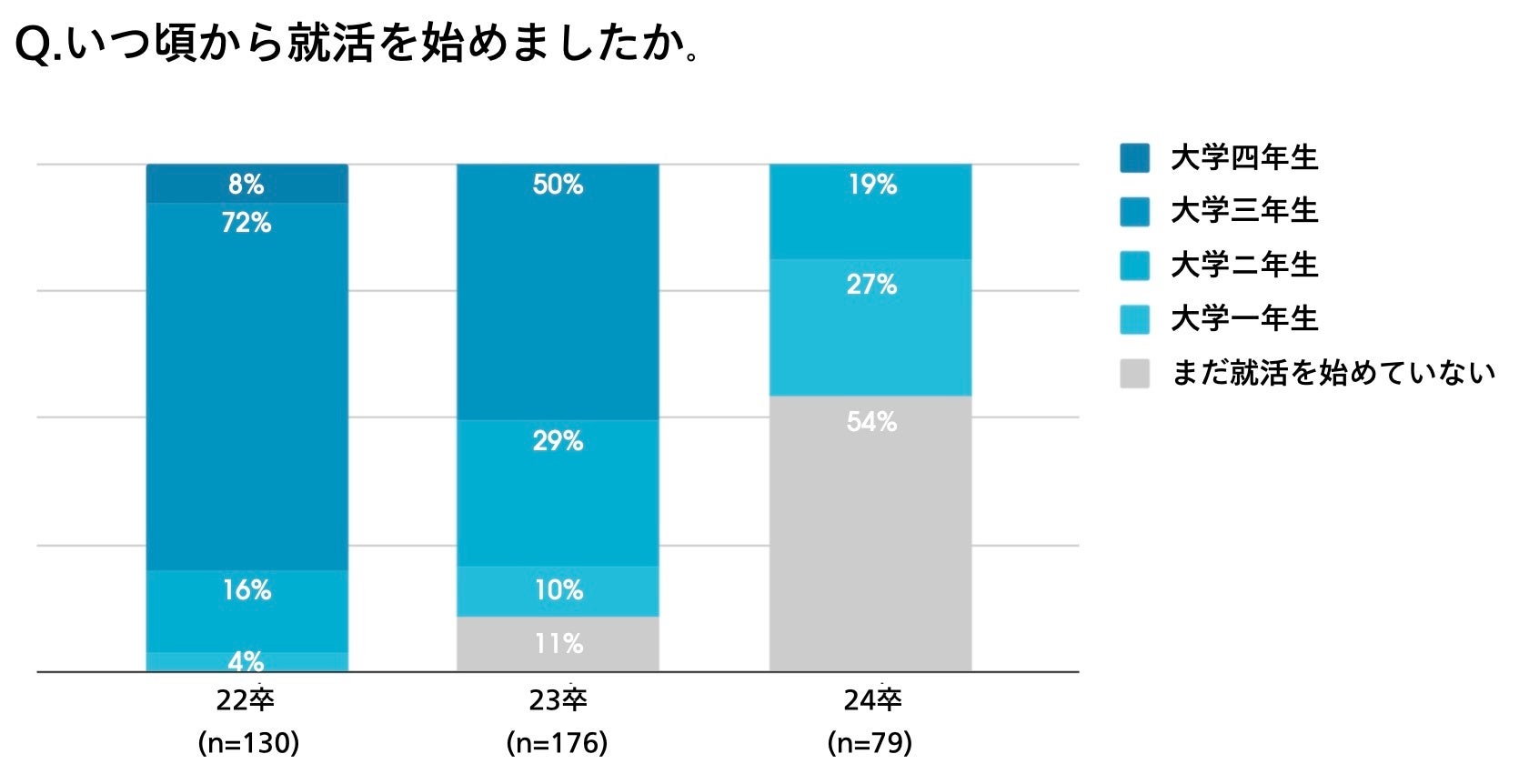 就活開始時期について聞いたところ、22卒の100%が、そして23卒の89%、24卒の46%の学生が既に就活を開始しているという結果に。大学一年生から就活を開始した学生の比率に注目すると、22卒の4%に対し、23卒では10%、24卒では27%と年々増加傾向にあり、就職に早期化の傾向が見られました。