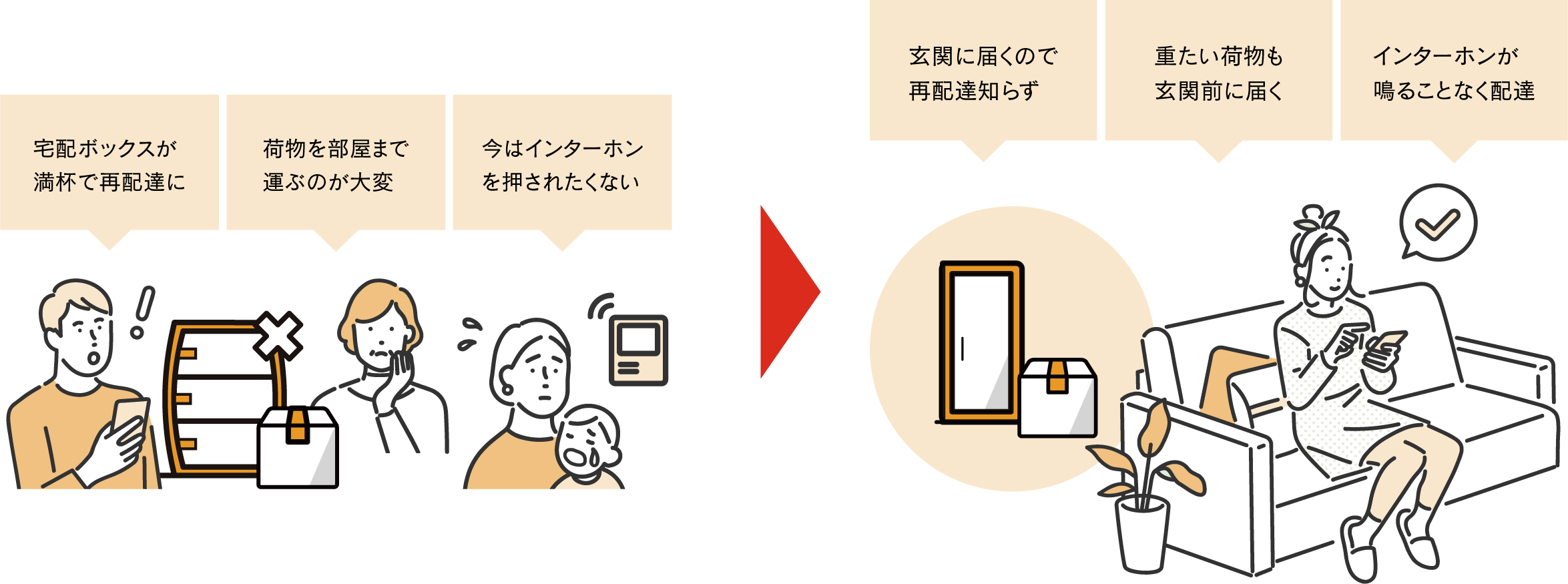 「置き配」を利用すれば不在時や宅配ボックスの空きがなくても荷物の受け取りを可能にするだけでなく、直接配達員に対応する必要がなくなるので感染症対策にもなります。また、手が離せないシチュエーションでも荷物の受け取りが可能になるので、あらゆる観点から入居者の満足度向上に貢献できると考えております。