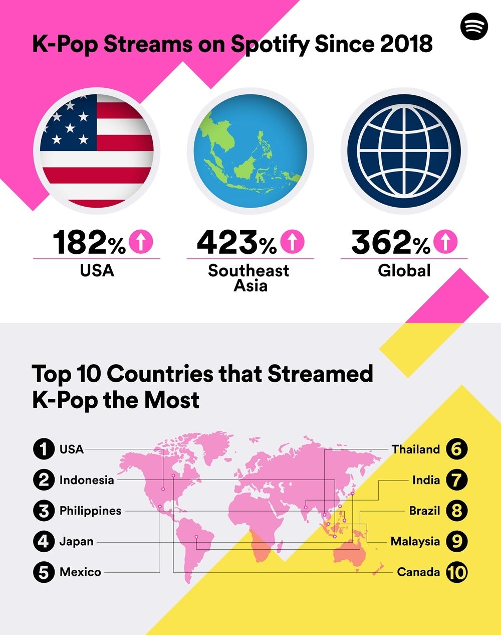 Spotifyのプラットフォームや、楽曲とリスナーの出会いを促進するために企画されたこれらの活動が、K-POPの成長に貢献していることもデータで明らかになっています。2018年以来、Spotify上でのK-POPの再生回数は日本で751%、アメリカで182%、インドネシアで461%、タイで1,040%、ブラジルで326%、メキシコで577%、東南アジアで423%、世界で362%も増加しています。現在Spotify上でK-POPが最も聴かれている主要マーケットは、アメリカ、インドネシア、フィリピン、日本、メキシコ、タイ、インド、ブラジル、マレーシア、カナダとなっています。