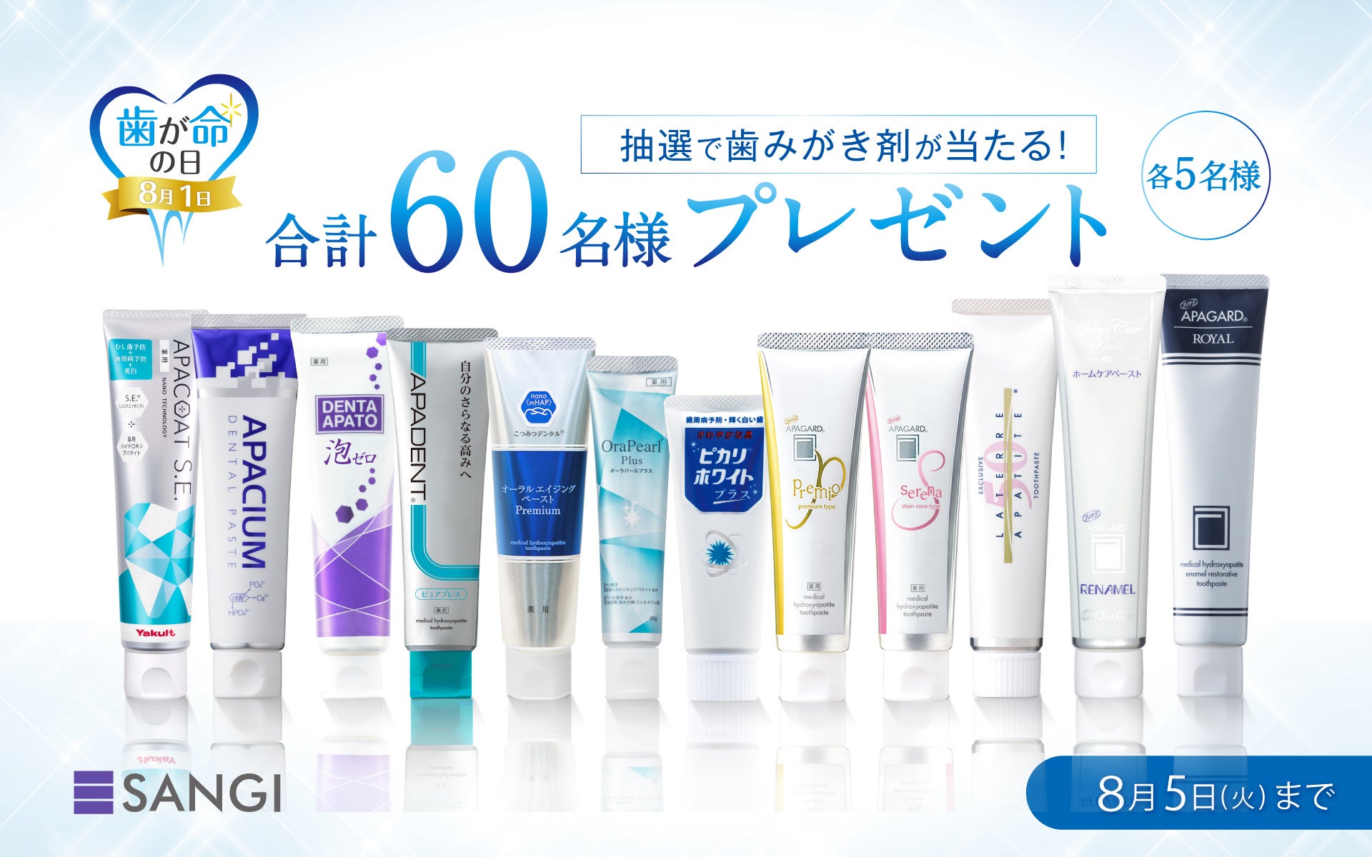 この「歯が命の日」を記念して、サンギ開発のむし歯予防成分「薬用ハイドロキシアパタイト」配合の歯みがき剤が60名様に当たるプレゼントキャンペーンを2025年7月3日(木)~8月5日(火)にて実施いたします。