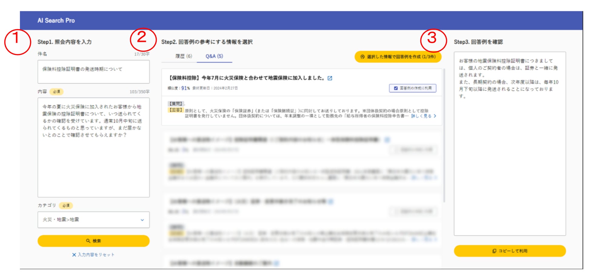 選択した事例から「AI Search Pro」が最適な回答例を作成