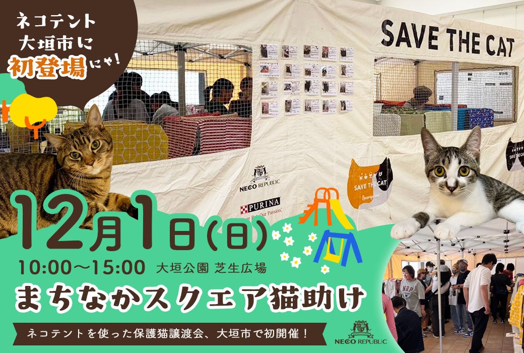 株式会社ネコリパブリック(本社所在地:東京都台東区蔵前、代表取締役:河瀬麻花)は、岐阜県大垣市にある大垣公園(芝生広場)にて、12月1日(日)「まちなかスクエア猫助け」を開催いたします。