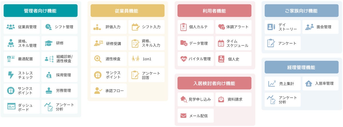 「ハイケアウェルネス」では、医療・介護現場のDXを支援するための従業員・利用者管理機能、ケア記録機能、離職防止機能、人材育成機能等を提供します。