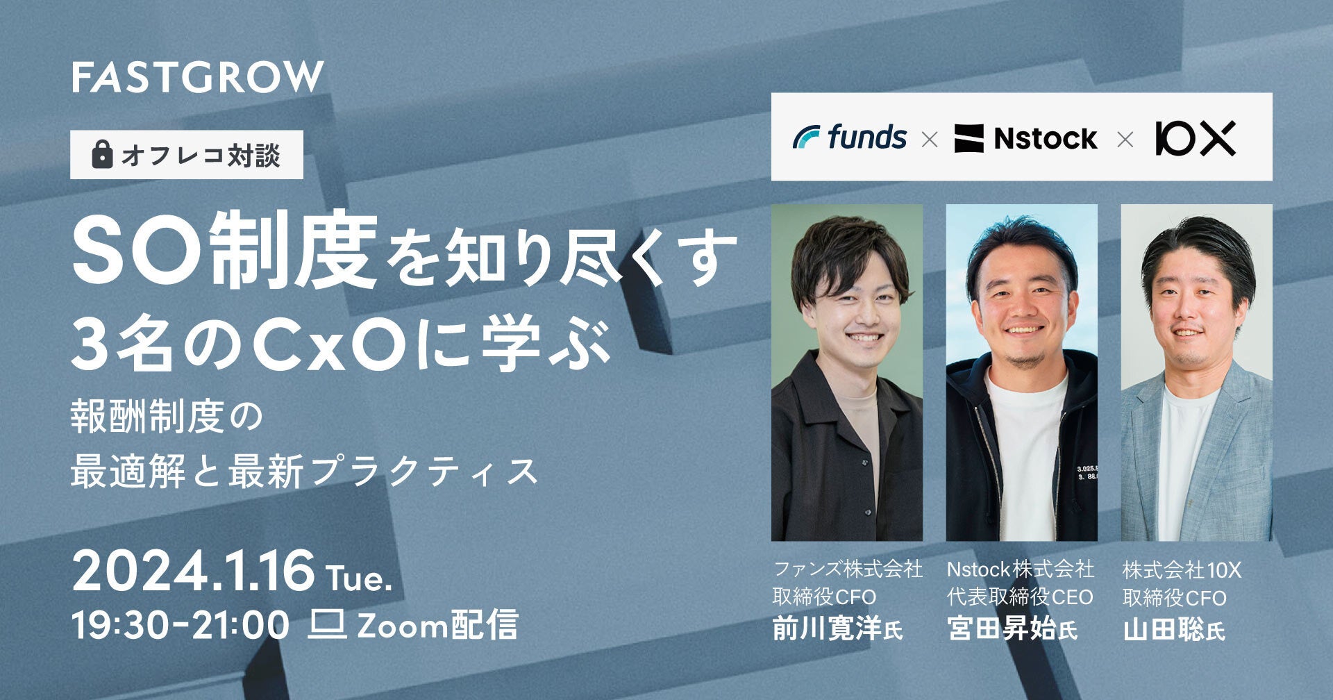 1月16日に当社取締役CFO 前川が、Nstock株式会社 代表取締役CEO 宮田氏、株式会社10X 取締役CFO 山田氏と共に登壇し、「スタートアップにおける報酬制度の最適解と最新プラクティス」をテーマにお話しします。