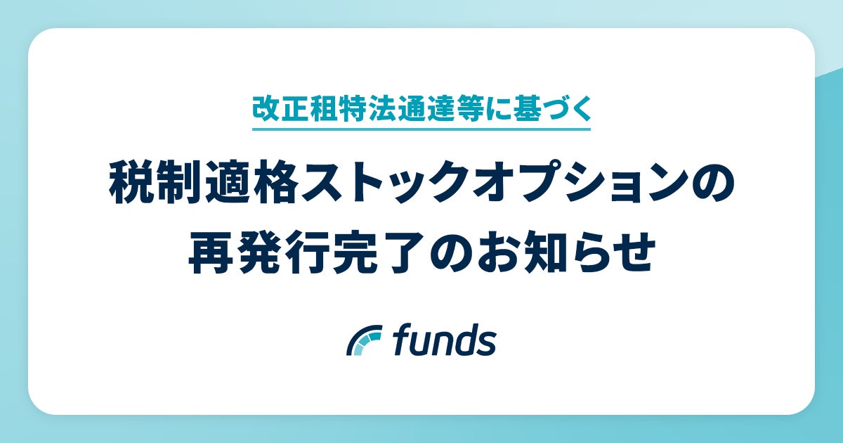 固定利回り投資の資産運用サービス「Funds(ファンズ)」を運営するファンズ株式会社(本社:東京都渋谷区、代表取締役CEO:藤田雄一郎、以下 当社)は、2023年12月時点で、2023年7月に示された税制適格ストックオプションに関する法令解釈通達に基づき、税制適格ストックオプションの再発行が完了したことをお知らせいたします。