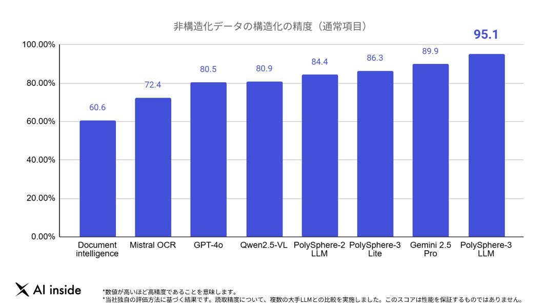 AI inside 株式会社(代表取締役社長CEO:渡久地 択、本社:東京都渋谷区、以下「AI inside」)は、日本語のドキュメント処理に特化した独自開発の大規模言語モデル(LLM)「PolySphere-2」を「PolySphere-3」へとメジャーアップデートし、データ構造化の精度において、世界最高性能を達成したことをお知らせします。