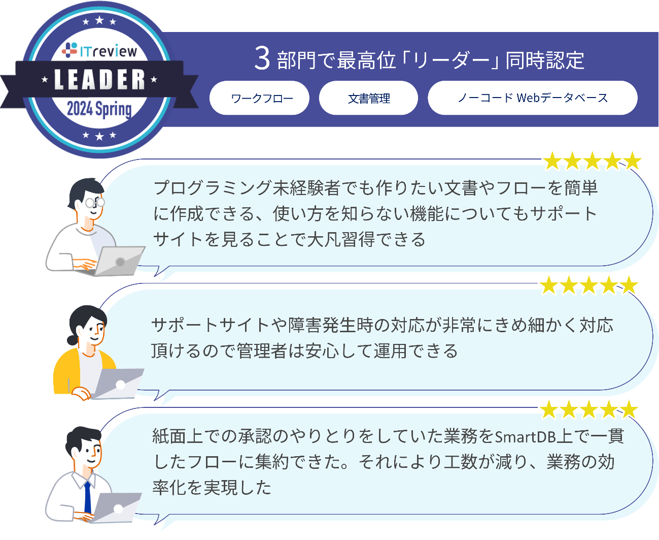 IT製品レビューサイト「ITreview」(※2)では、実際にSmartDB(R)を活用しているユーザーから次のような高い評価を受けており、SaaS市場全体で、ワークフロー、文書管理、ノーコードWebデータベースの3部門で同時にLEADER認定されています。