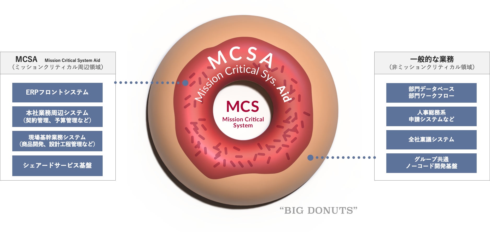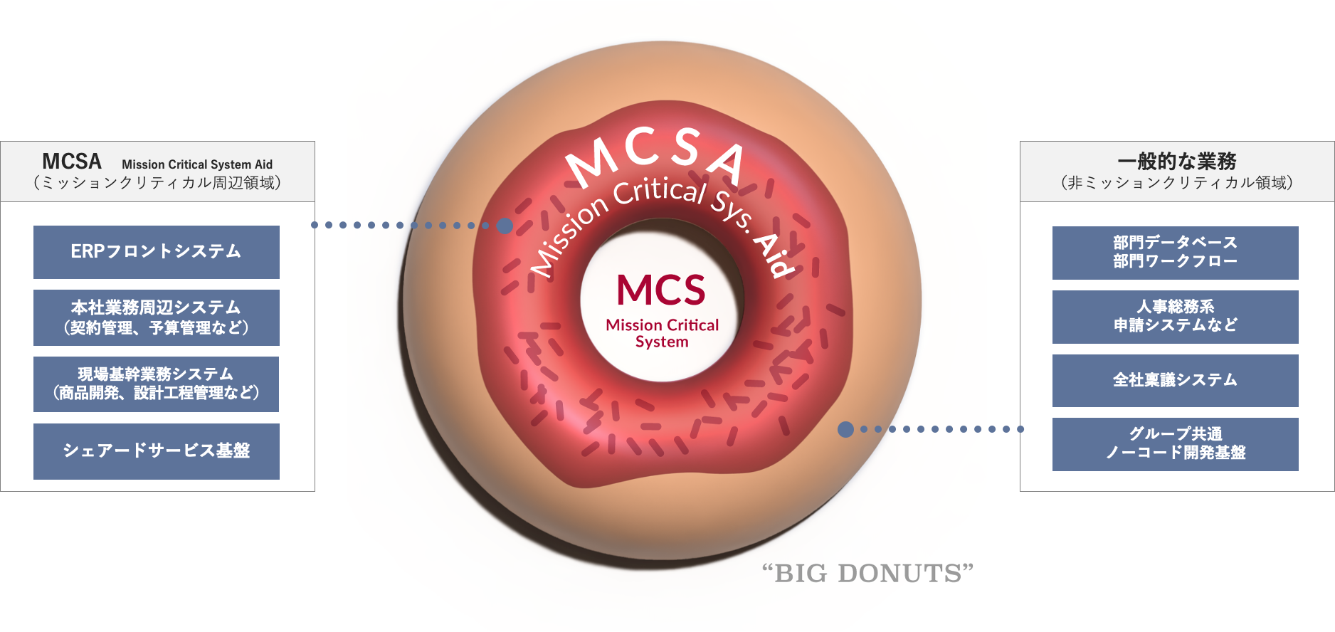 ドリーム・アーツの掲げる「ミッションクリティカル領域のシステム(MCS)を支える」というコンセプトのこと。 Support(サポート)ではなくAid(エイド)という表現を使用している理由は、Aidという言葉が「困難な状況にある人や組織を実践的に助ける」という意味を含むためであり、「BD(ビッグドーナツ)領域の業務デジタル化」に取り組む姿勢を示しています。 MCSは、企業や組織の存続に欠かせない業務を遂行するうえで重大なシステムです。 財務会計システム、人事労務システムなどが業種を問わず該当しますが、業種特有のMCSには金融機関の勘定系システム、製造業の生産管理システム、鉄道会社の運行管理システムなども挙げられます。 MCSAの代表例にはこれらMCSを支える、ERPフロントシステムや契約管理業務や、現場期間業務システムとして工程管理システムなどが該当します。