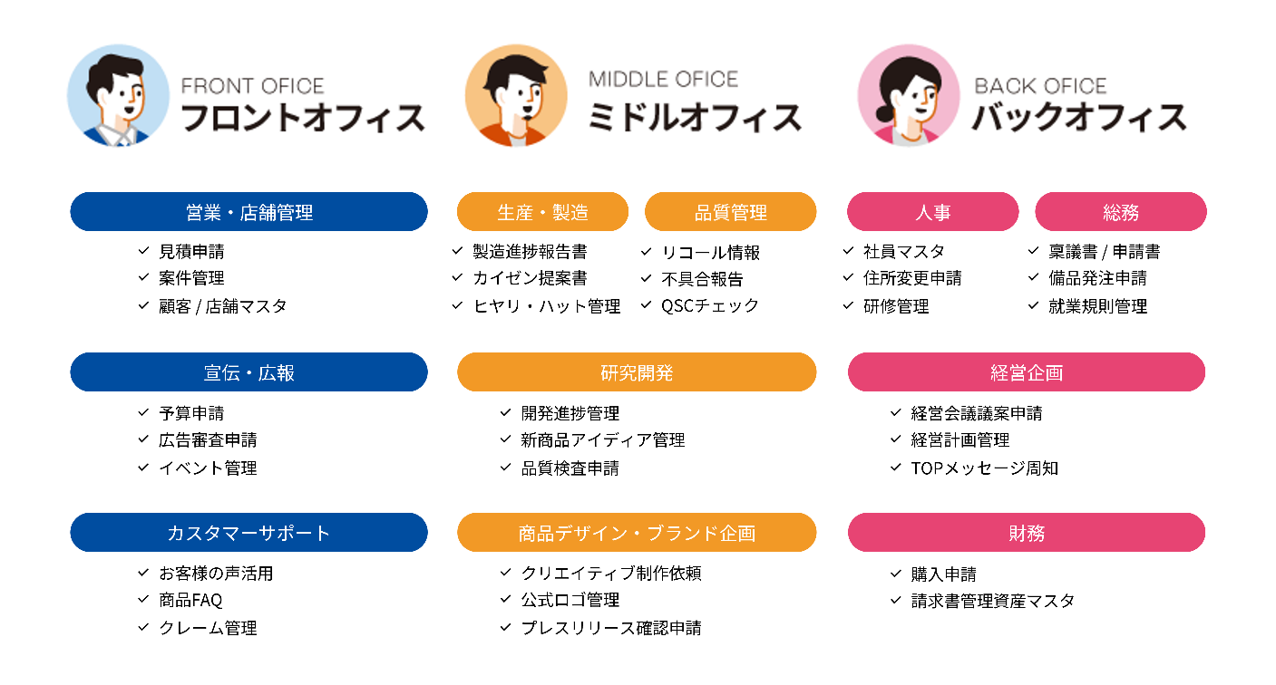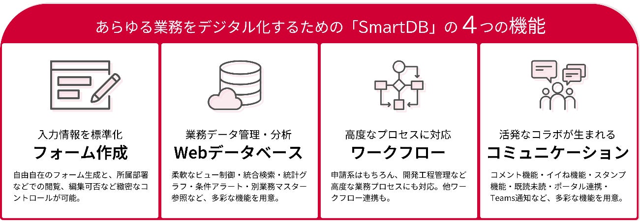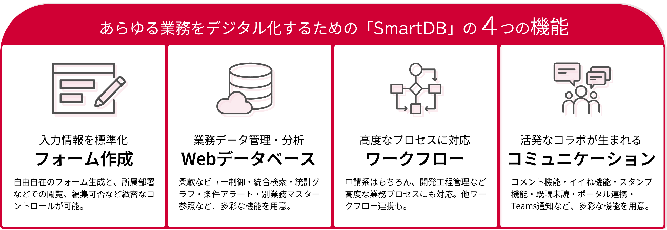 SmartDB(R)は部門個別業務から全社横断業務まであらゆる業務をデジタル化できる機能を持っています。 業務部門主体で容易に開発できるUI/UX、充実の業務テンプレート、大企業特有の緻密な権限制御への対応などが高まる「デジタルの民主化」の市場ニーズにマッチし、顧客に評価されているポイントです。