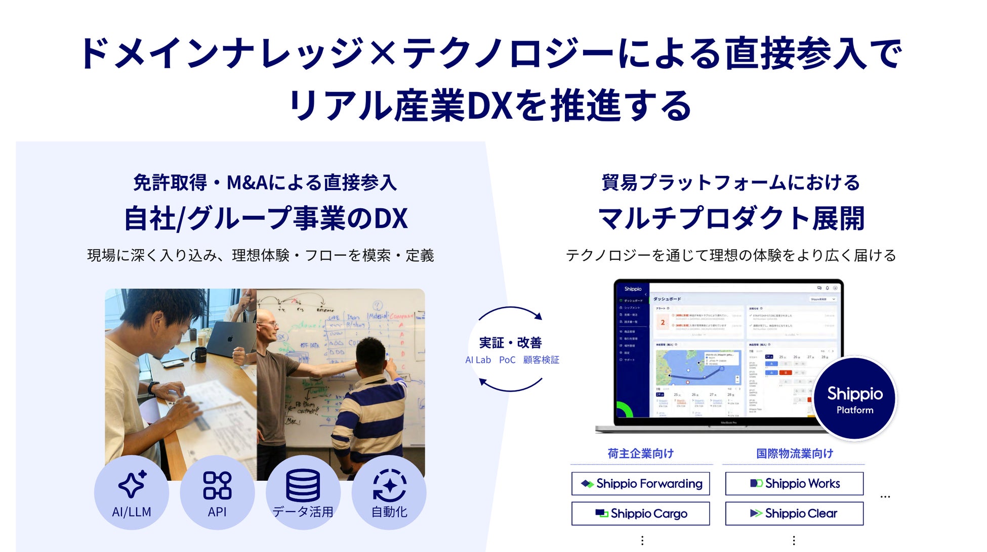 Shippioは「国際物流を、アドバンストに」をビジョンに掲げ、貿易プラットフォームを構築しています。Shippioの提供するクラウド上では、貨物船トラッキングや見積もり・発注、貿易書類の一元管理・関係者間での情報共有、チャットコミュニケーション等が可能となり、デジタルを活用したビジネスプロセスの構築とオペレーションの提供を通じて貿易DXを推進しています。