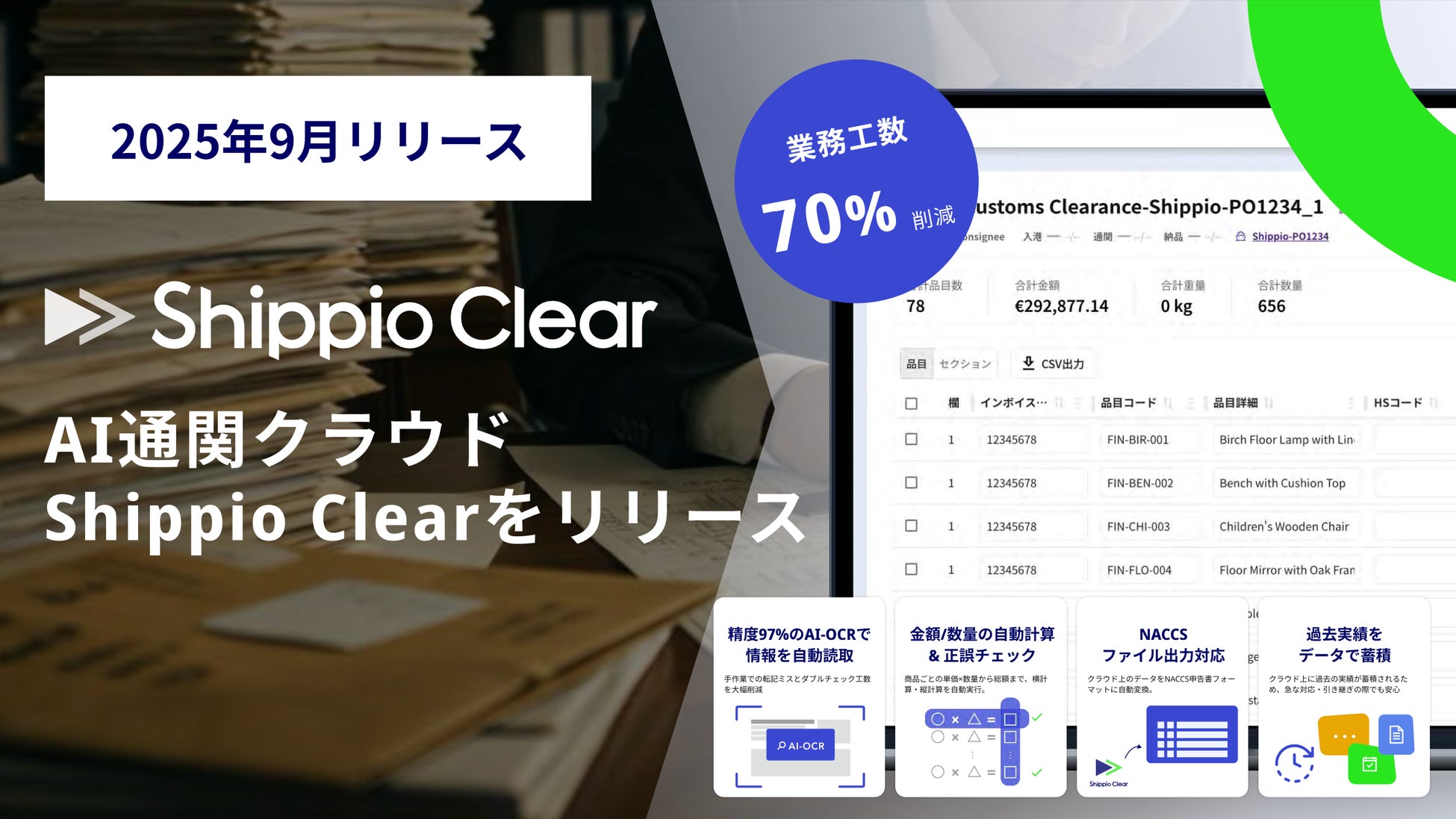 2025年9月に提供開始したAI通関クラウド「Shippio Clear」において、精度97%のAI-OCRによる書類情報の自動読み取りや、金額・数量の自動計算、NACCS(輸出入・港湾関連情報処理システム)形式への自動変換機能を実装 。手作業での転記や目視チェックの手間を劇的に解消し、確認作業を1/10に短縮、全体の業務工数70%削減を実現した圧倒的な成果が評価されました。