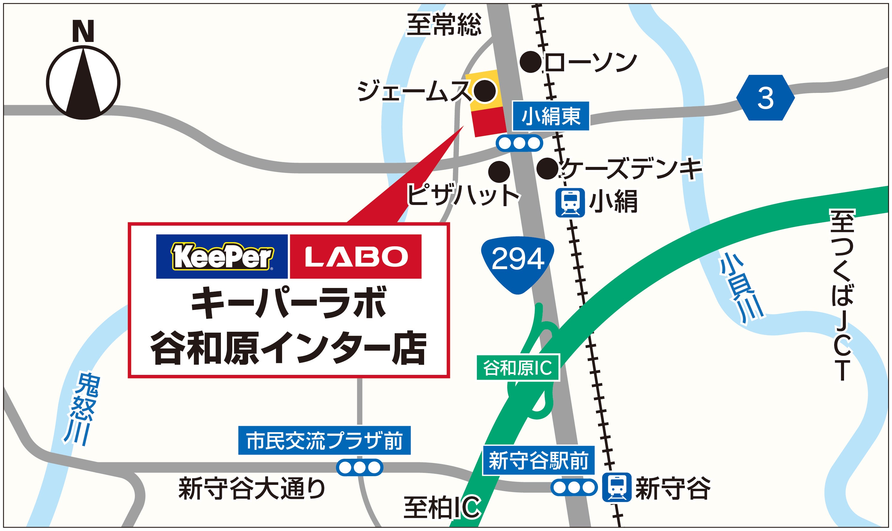 KeePer LABO谷和原店は、茨城県南部に位置するつくばみらい市の主要道路国道294号線に面した店舗で、